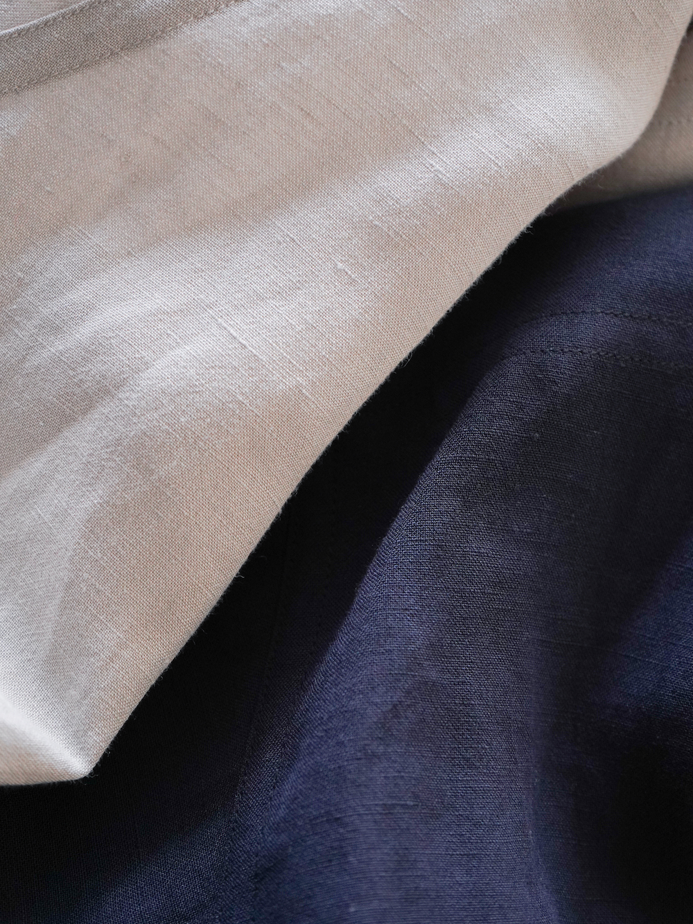 レーヨンとポリエチレンを混ぜ合わせることで素材そのままのナチュラル感がいい意味で軽減され、リネンだけでは成し得ない微光沢のとろみ感を生み出してくれる。