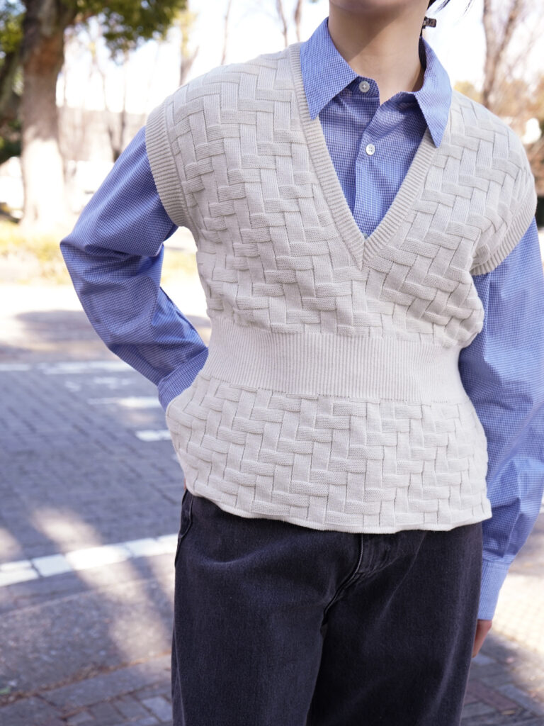 SSは素材が変わりノットヤーンという筋のあるリブニットを使用した、夏の蒸し暑い時期にもサラッとドライな着心地がウリのサマーニットになりました。