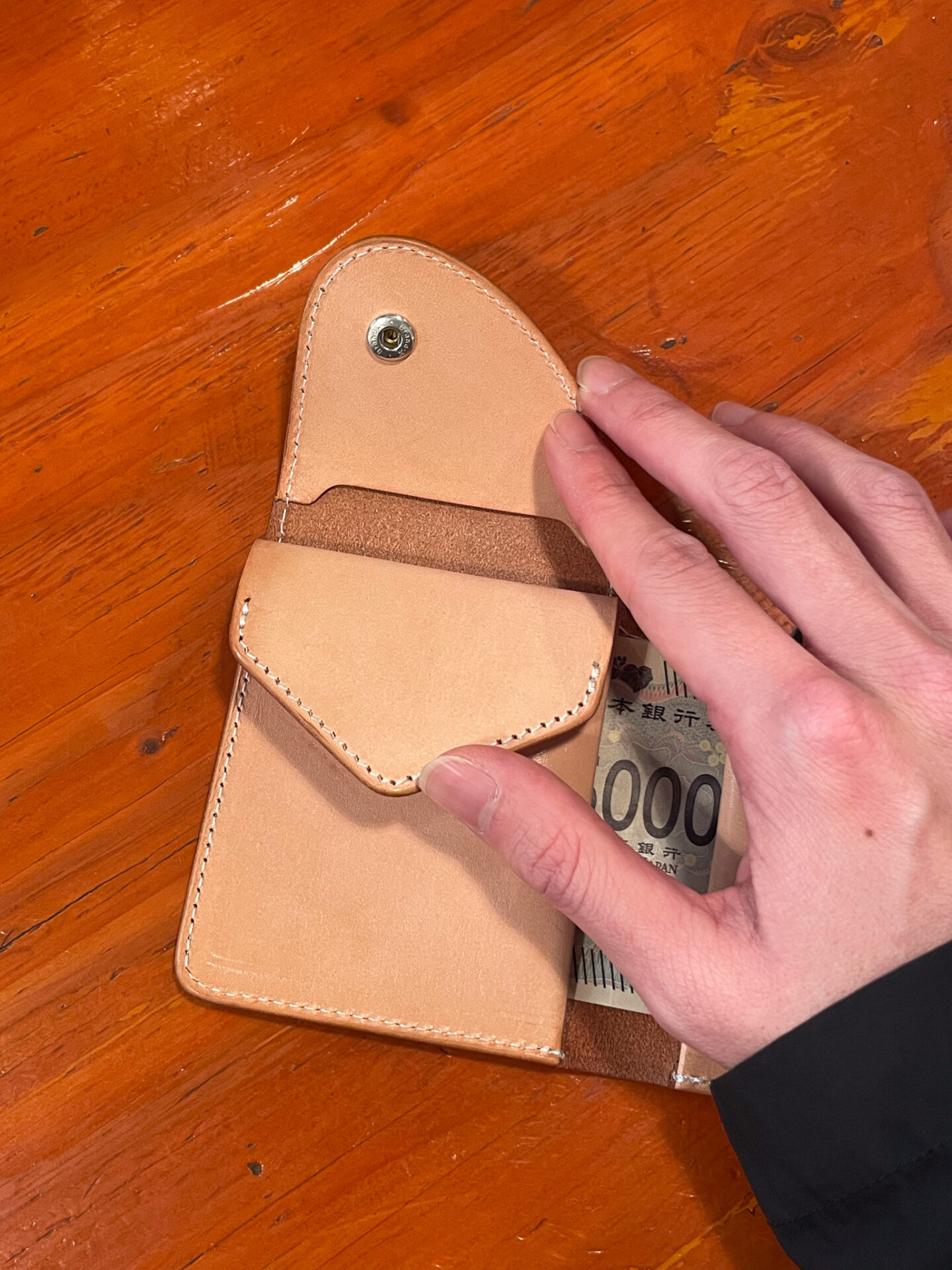 革以外のパーツはフロントのボタンのみのとてもシンプルに作られたお財布。ただシンプルなのではなく、必要な機能を携えたまま究極の引き算ともとれる内容だと思っています。