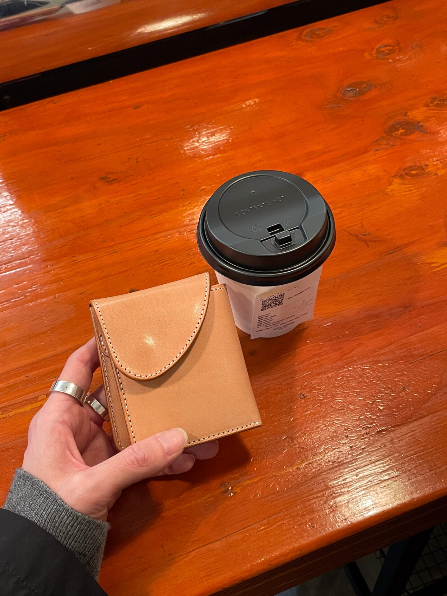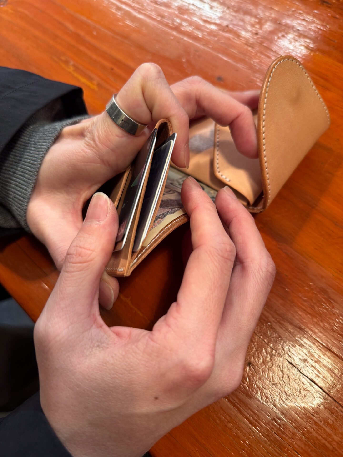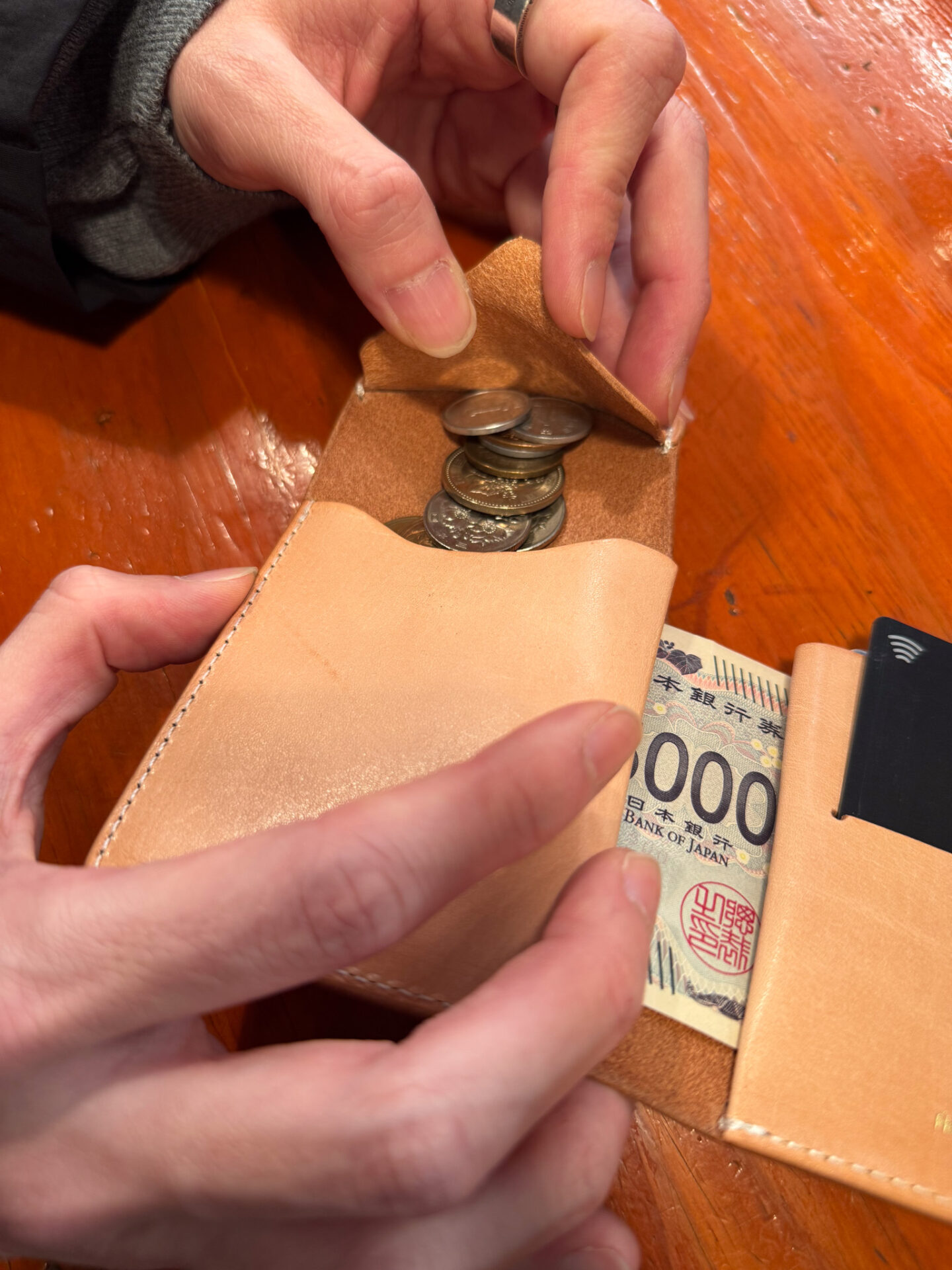 その辺りも踏まえてwalletはとてもよくできていると感じます。革のパターンによって作られるスペースでそれぞれお札、小銭、カードと入れる場所が設けられており、実際の使い心地も考えられています。