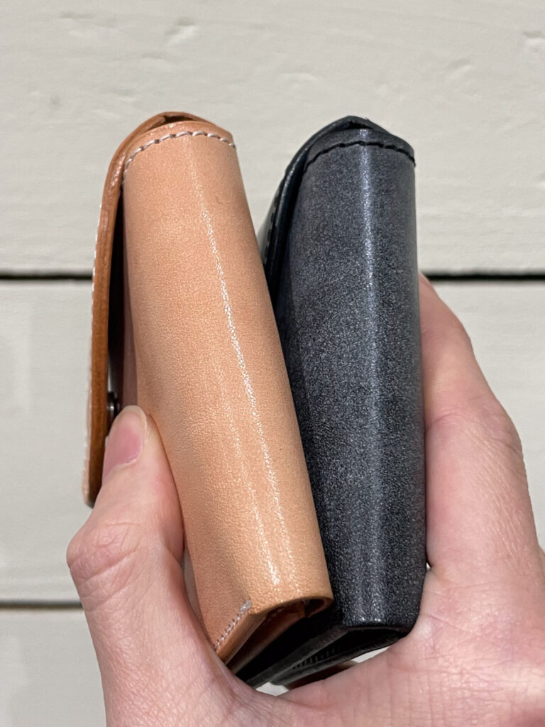 経年変化のところで言うと、ナチュラルは最初が薄いベージュのような色ですが、アメ色になります。ブラックはロウの白っぽさが表面に浮いていますがこれも馴染んでいくとツヤのあるブラックに変わっていきます。