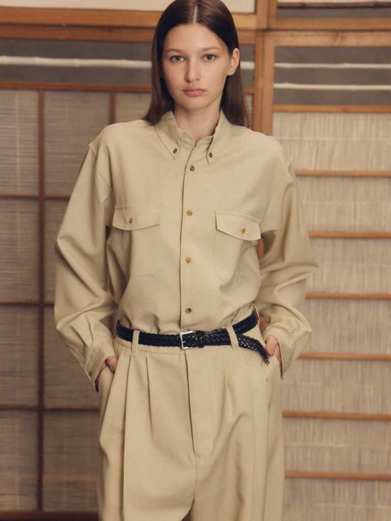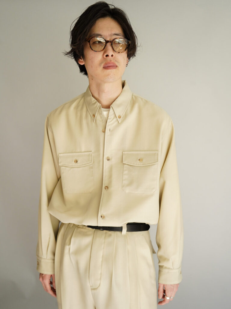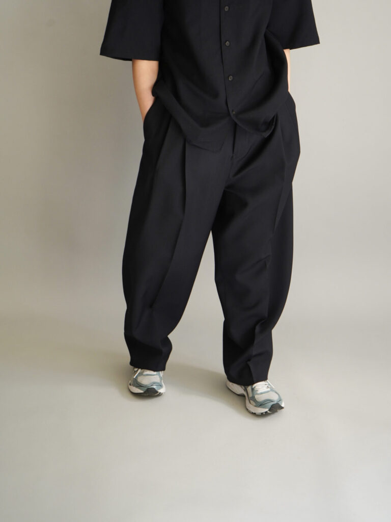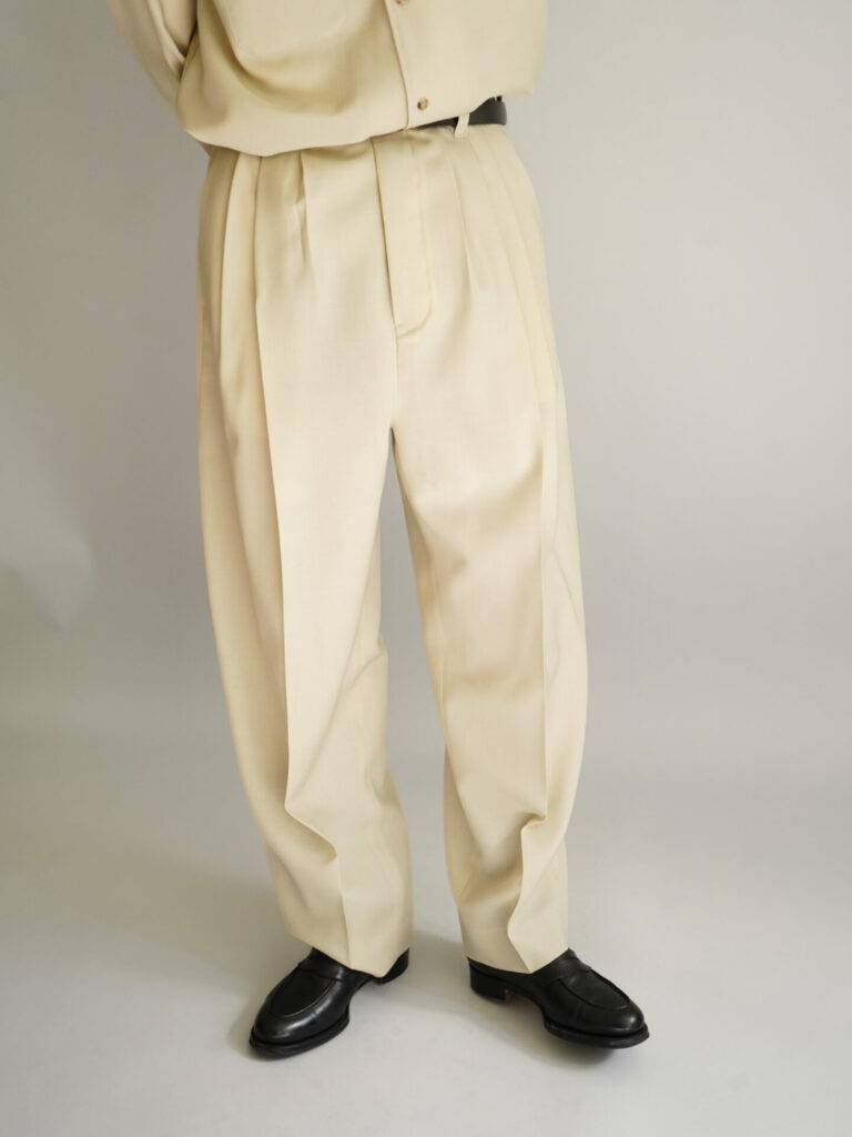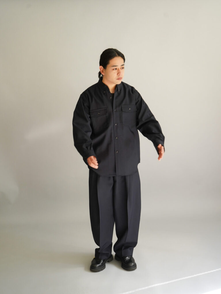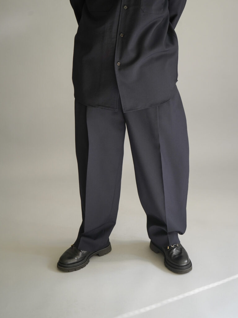 4つの型全てがウールをベースとした生地を採用しています。シャツ、パンツはウールモヘアの含浸加工を施した、ハリとドレープを持った生地。スーツなどに使われるのが一般的ですね。