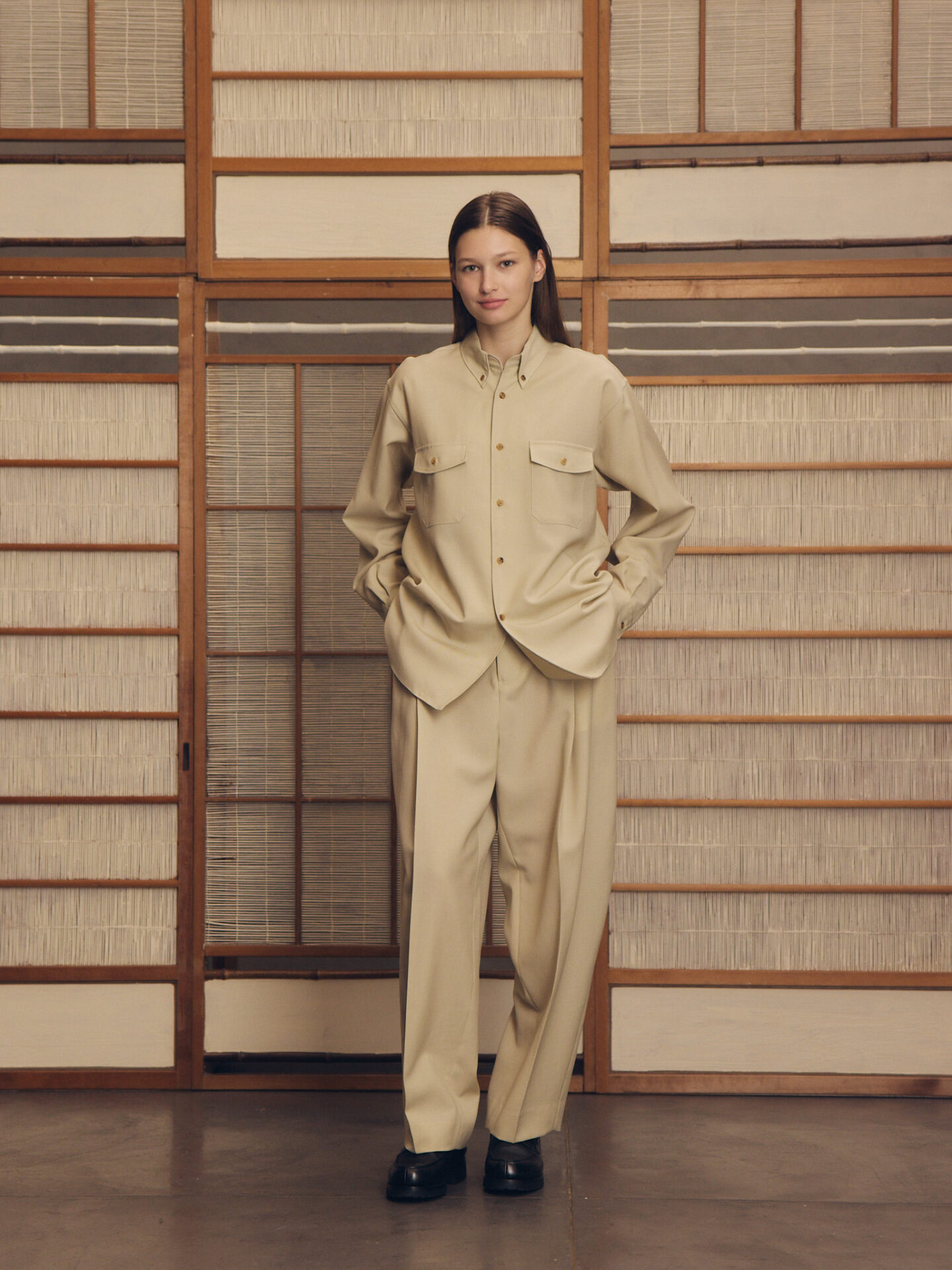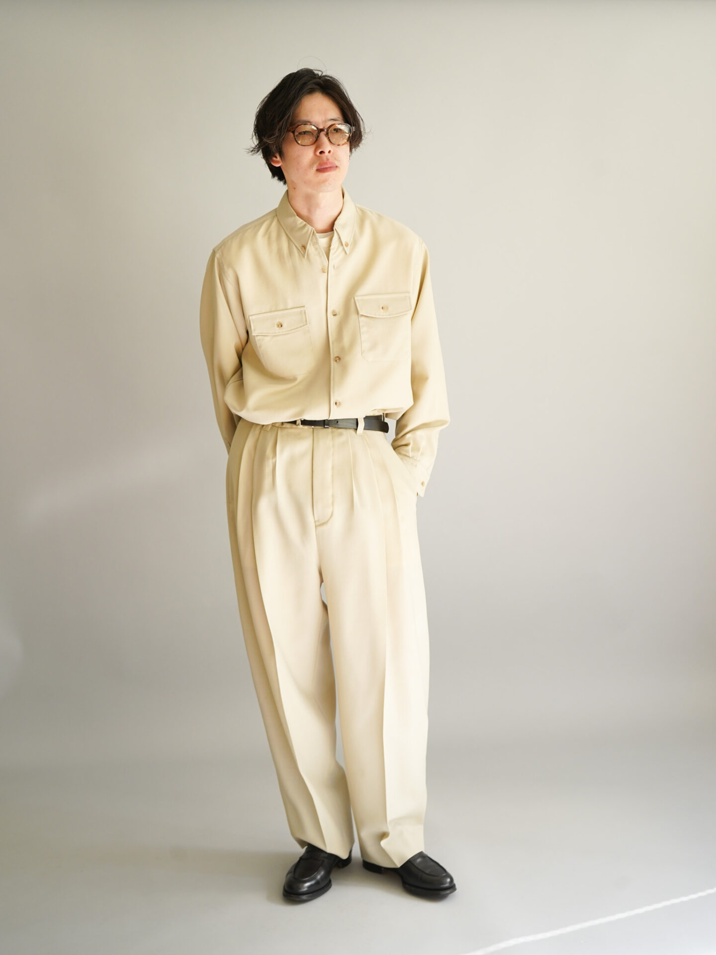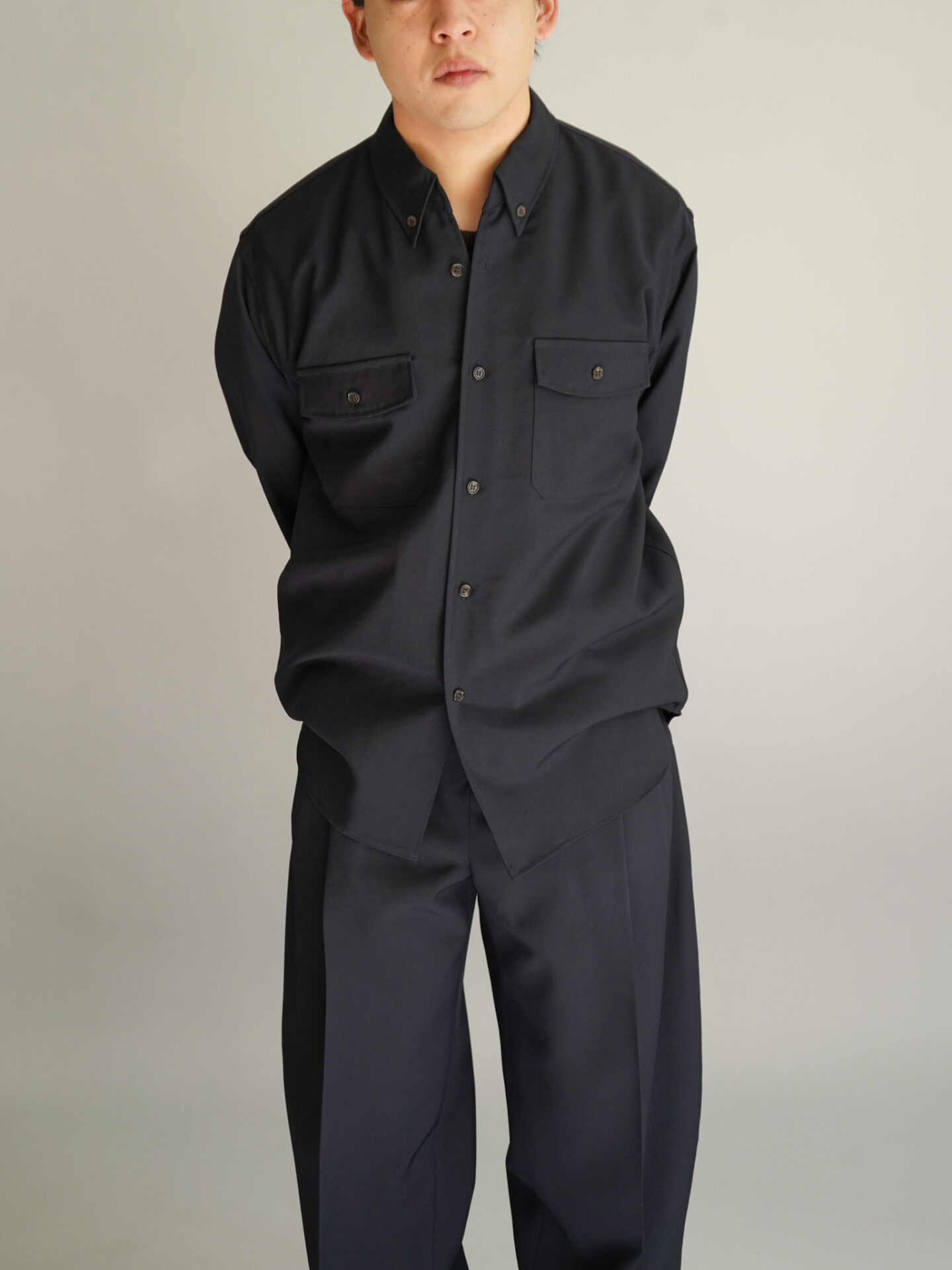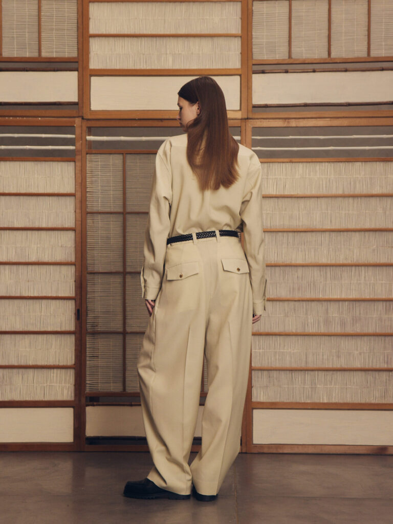 4つの型全てがウールをベースとした生地を採用しています。シャツ、パンツはウールモヘアの含浸加工を施した、ハリとドレープを持った生地。スーツなどに使われるのが一般的ですね。