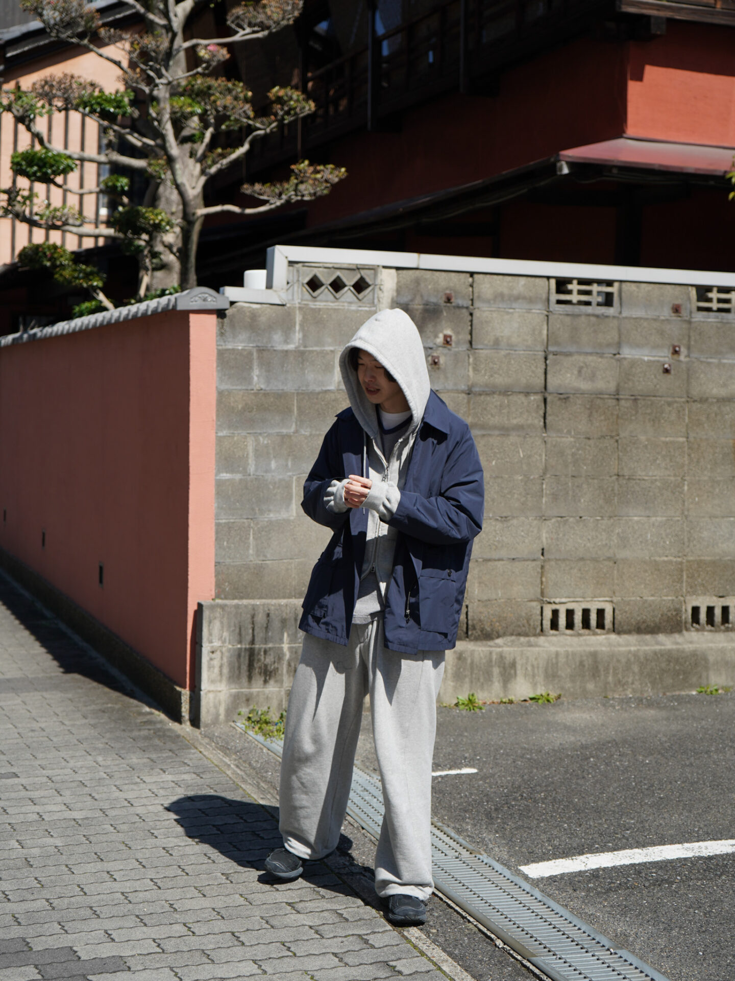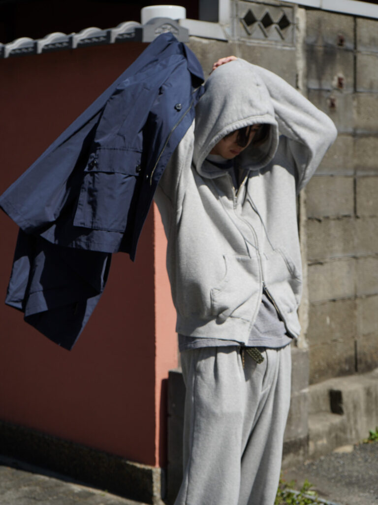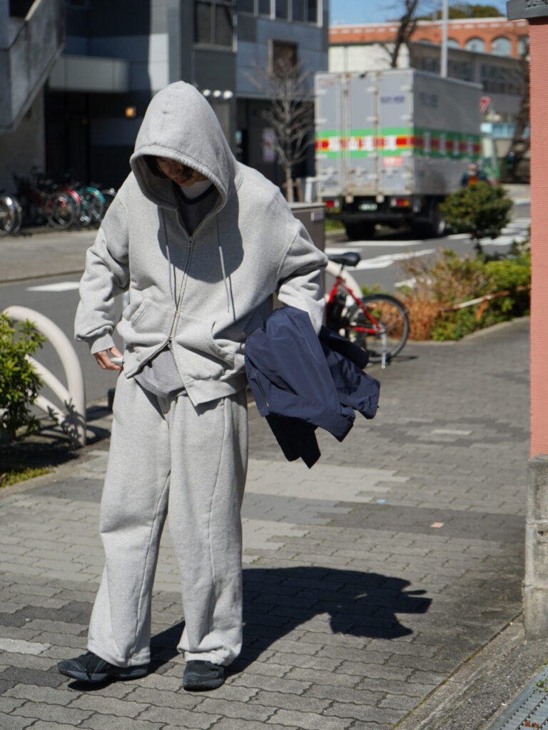ちょっと小洒落てスウェットセットアップに羽織をオン。なんてのもできちゃいます。パジャマっぽくならないようスラックス型になったジャンベルカスウェットパンツが優秀でこの辺りもついつい穿いてしまいがち。