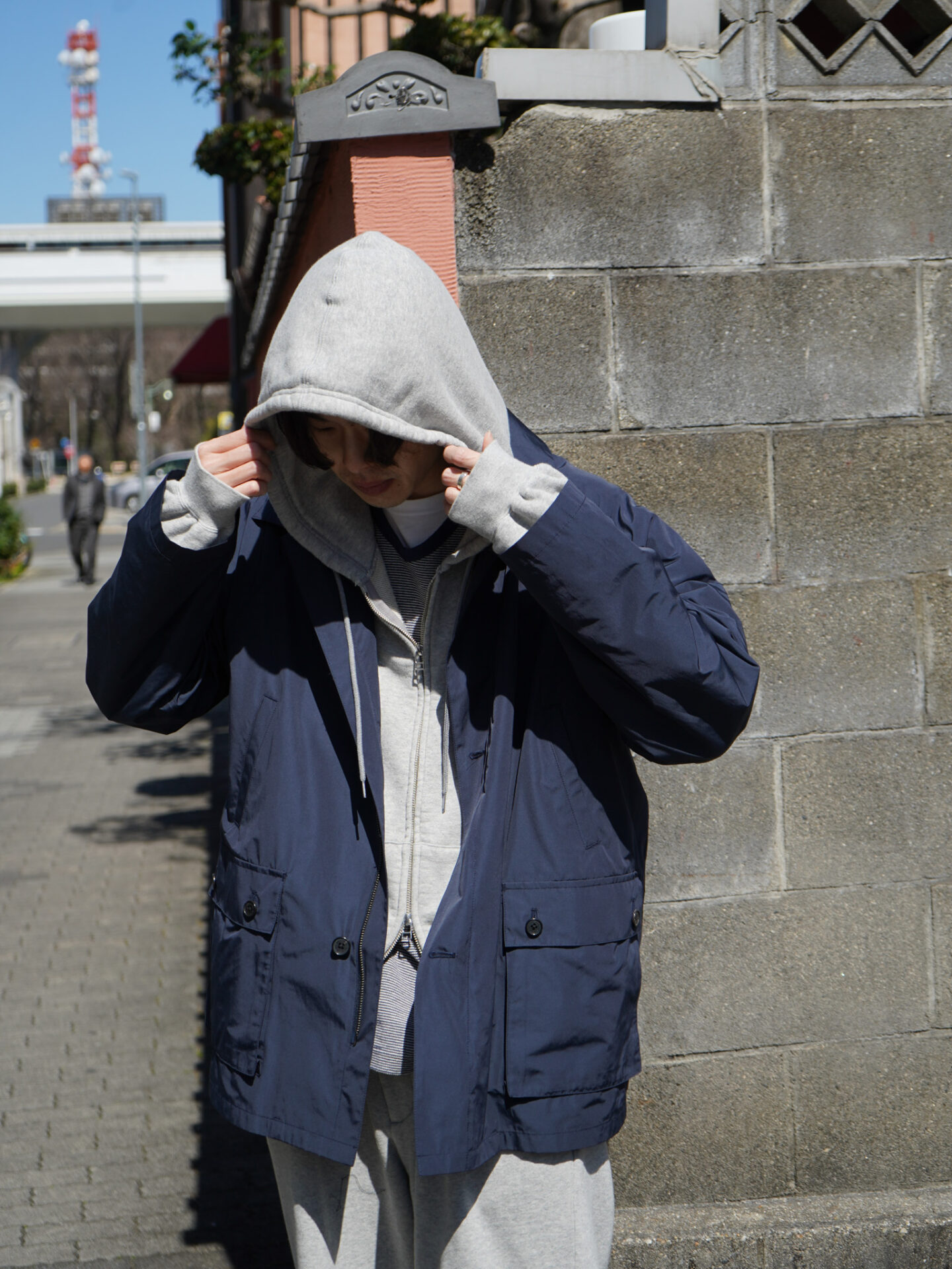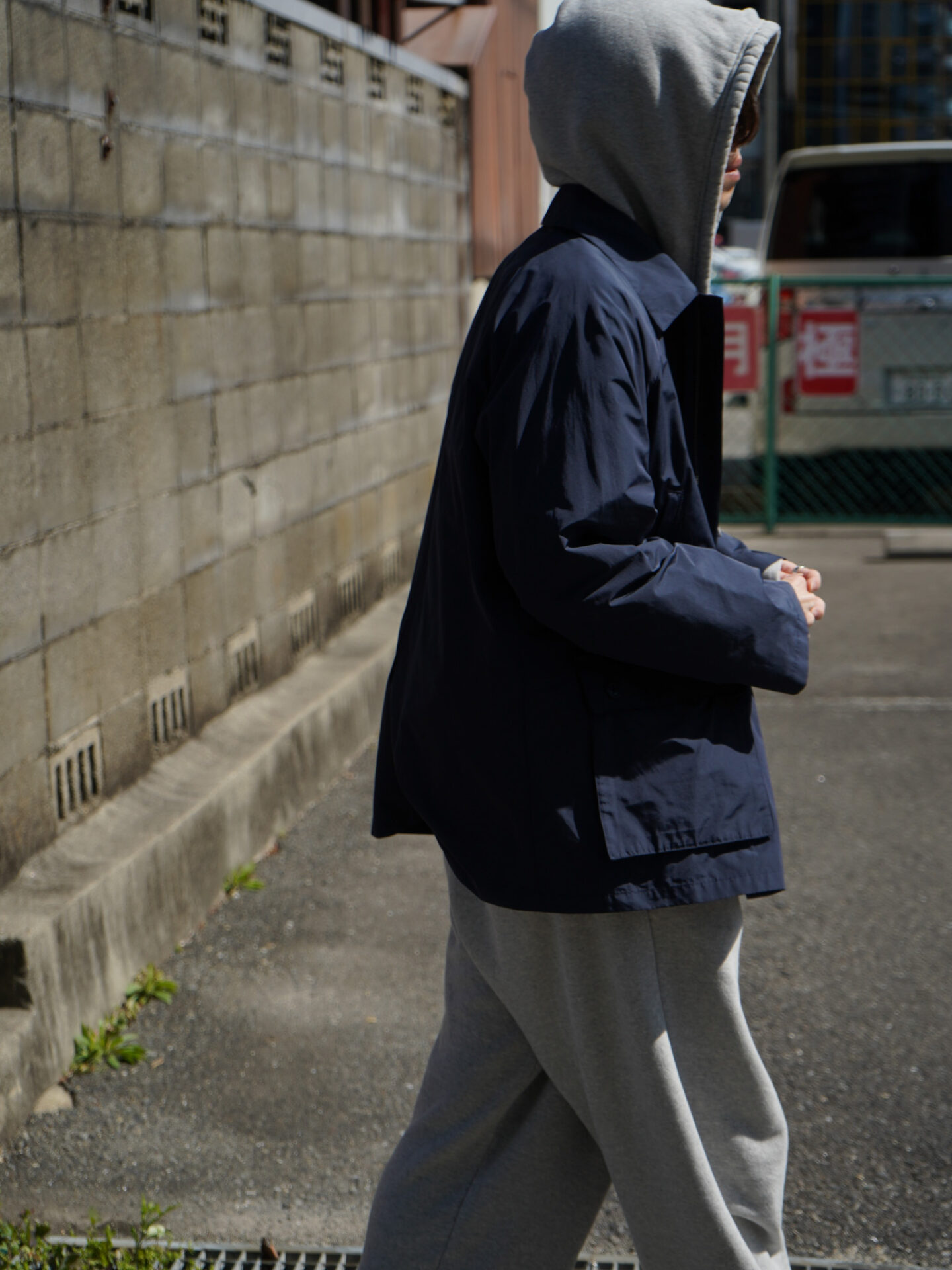 綿/ポリエステルの平織りのブロード素材は適度なハリと薄さがあります。着ても、カバンに突っ込んでも嵩張らず、シワにもなりにくいので何の気なしに持ち運べる嬉しさ。化繊が入ることと高密度によって防風性もあるため、ここ最近の強風からも体を守ってくれます。