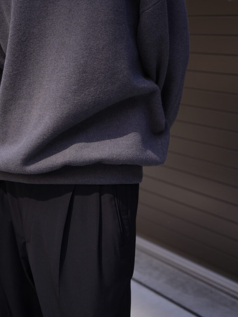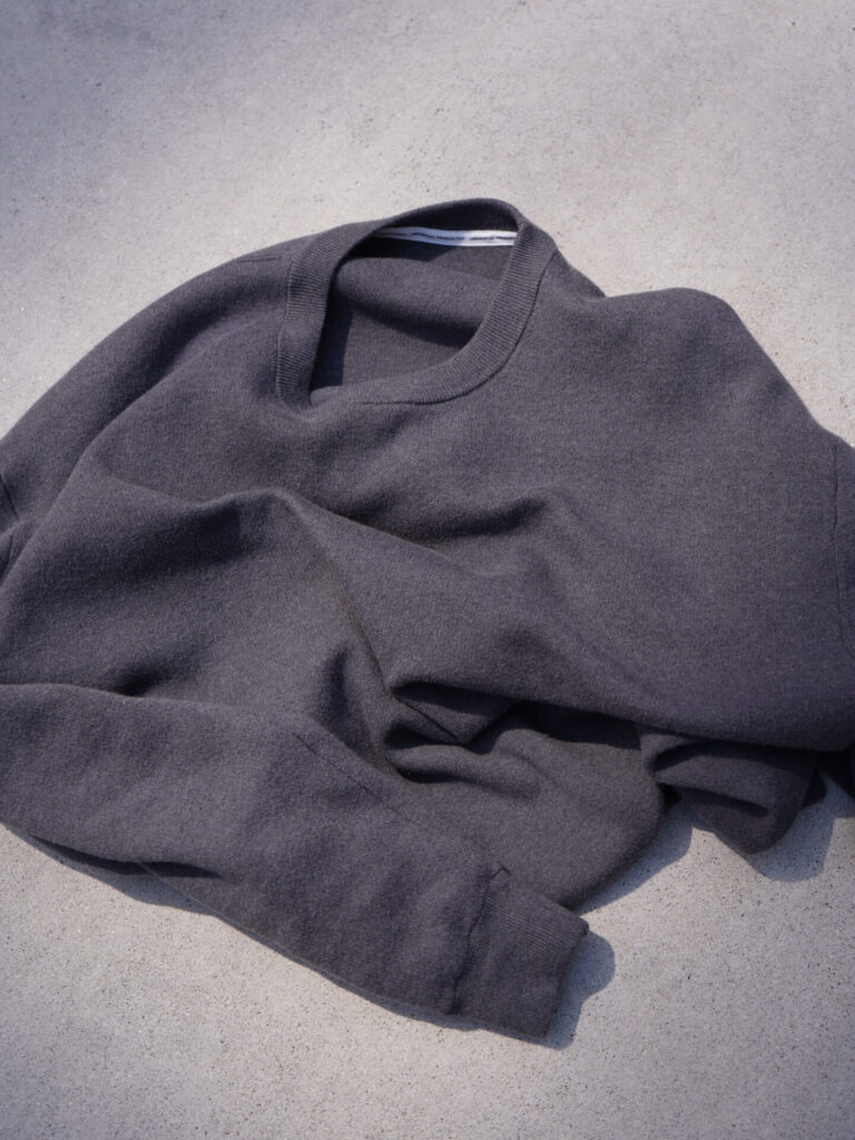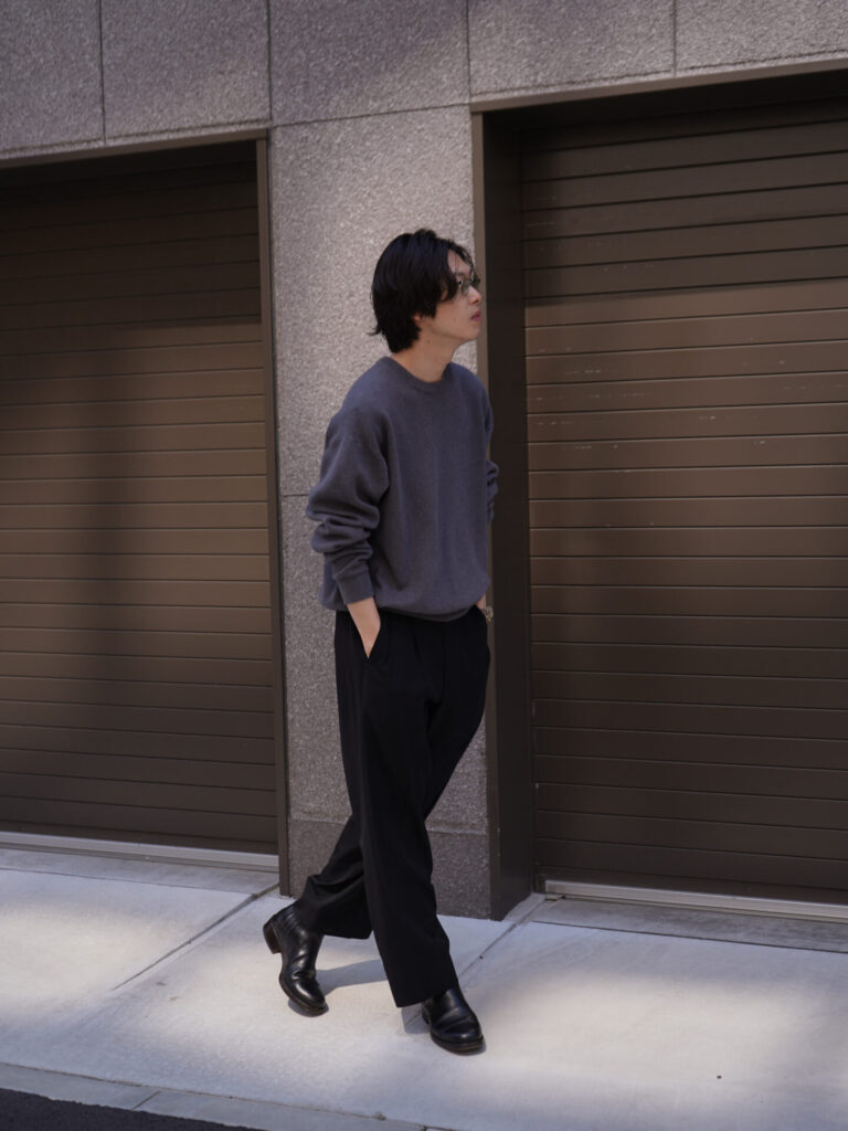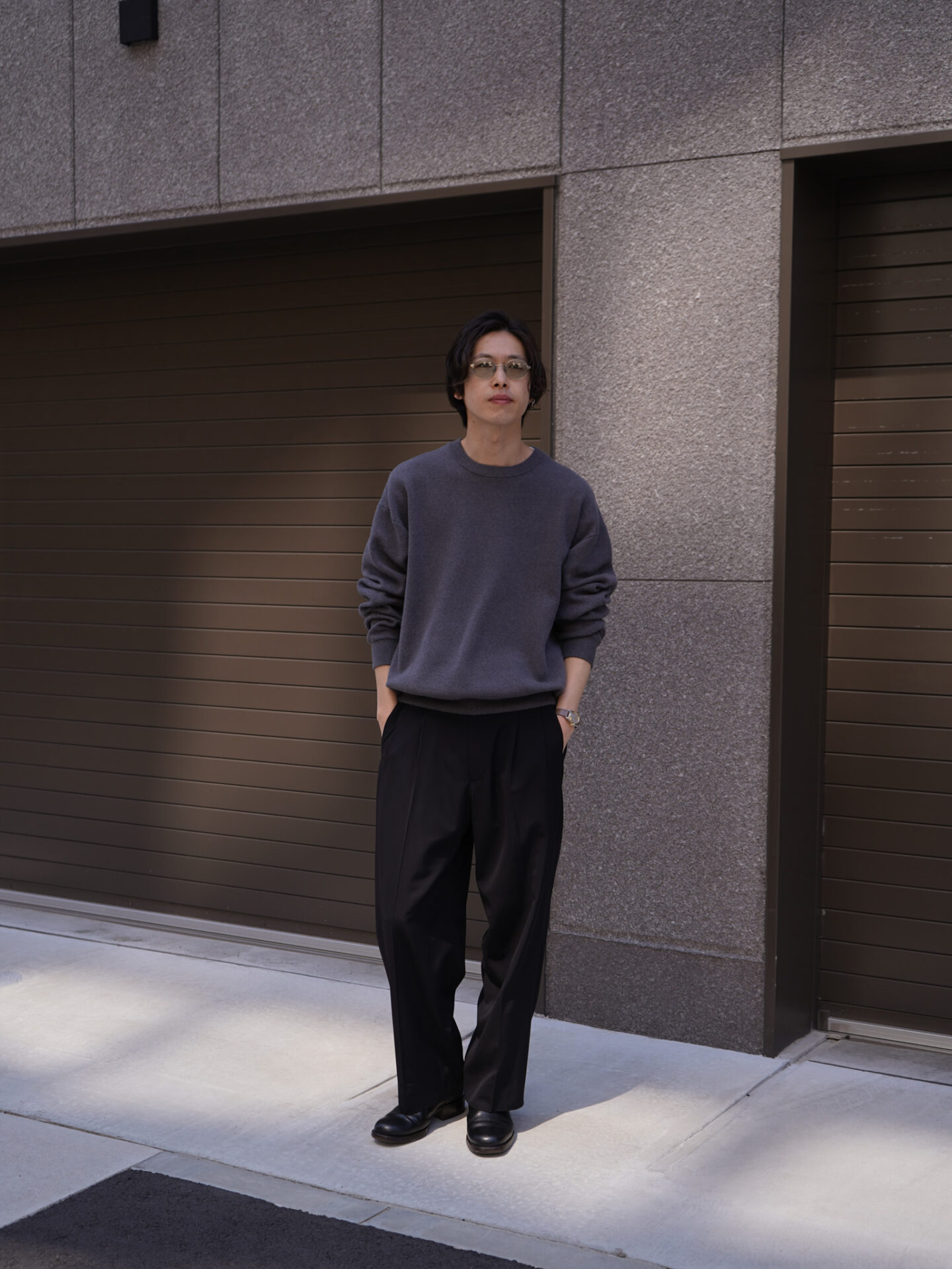 いろんな糸をミックスすることでの表情の奥行きもあることでスウェットのような見た目も意識し色味もチャコールの選択となりました。