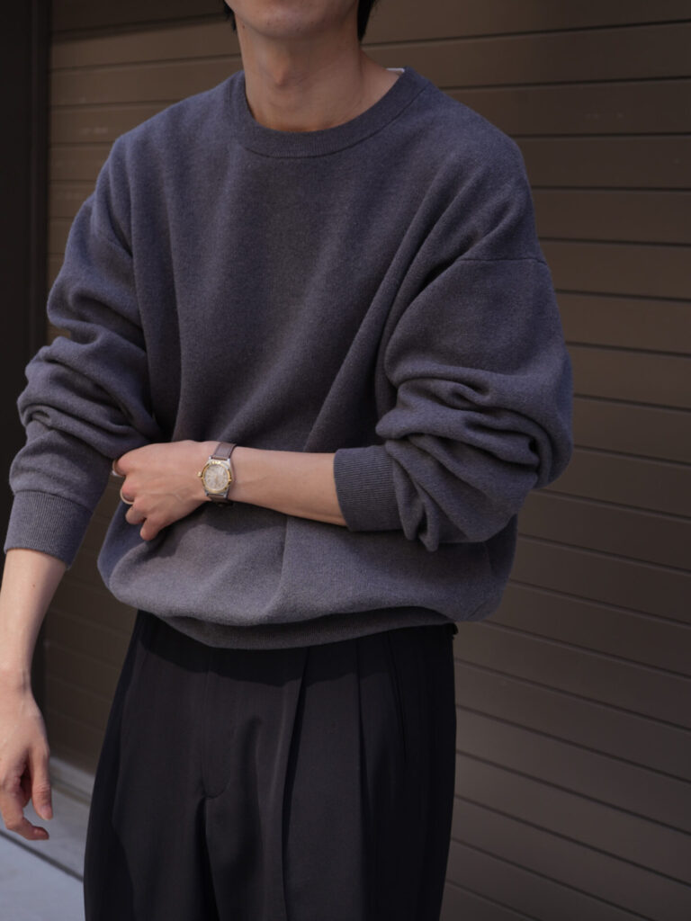 個人的には寒い時はスウェットの選択肢は理にかなっていますが、保温力には長けていても熱を逃すことは得意じゃないのがスウェットの特徴だと思っています。要領そのままに快適さを求めたくて制作した今回のニットはまさに”スウェットのようなニット”