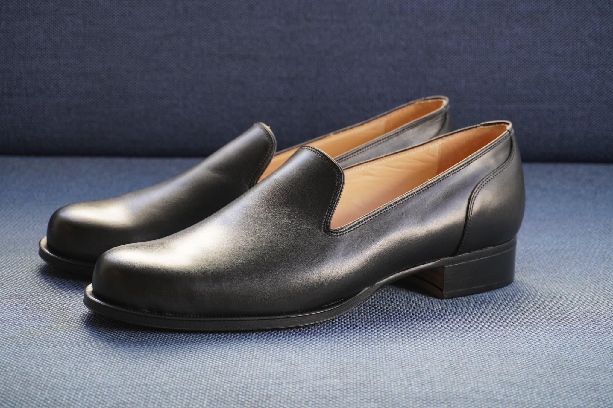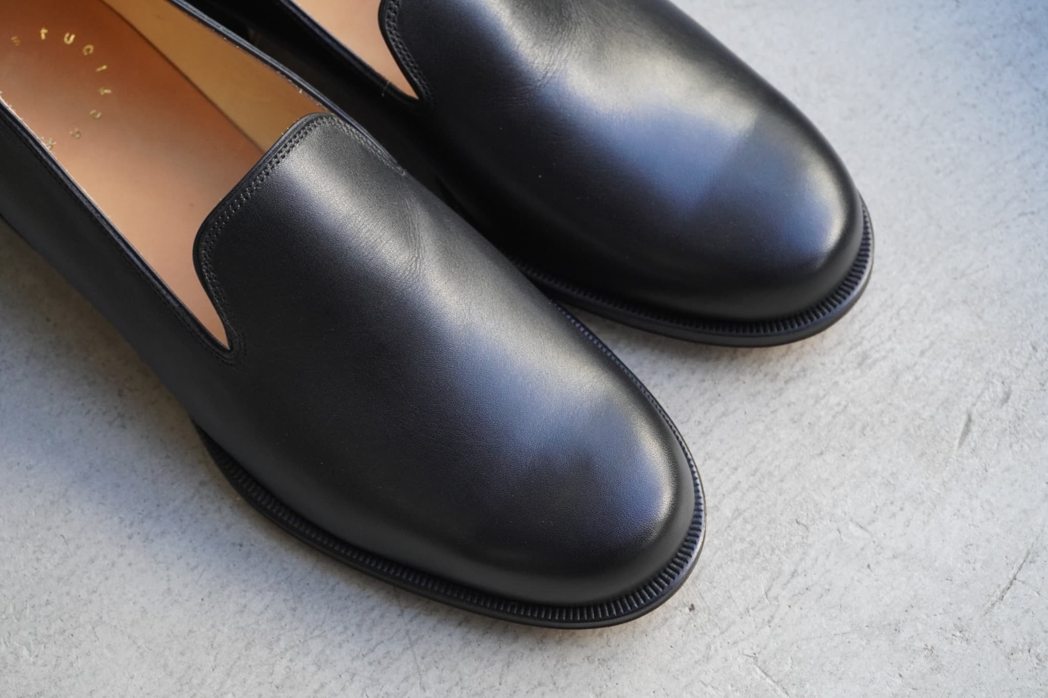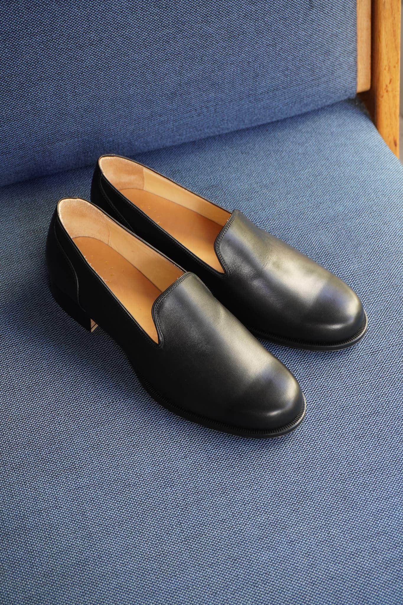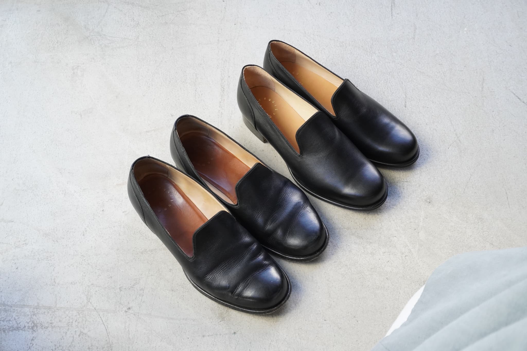 一般的なローファーと比べ、ボリュームのあるエッジの効いたトゥ先部分と高めに設定されたエレガントなヒール部分。