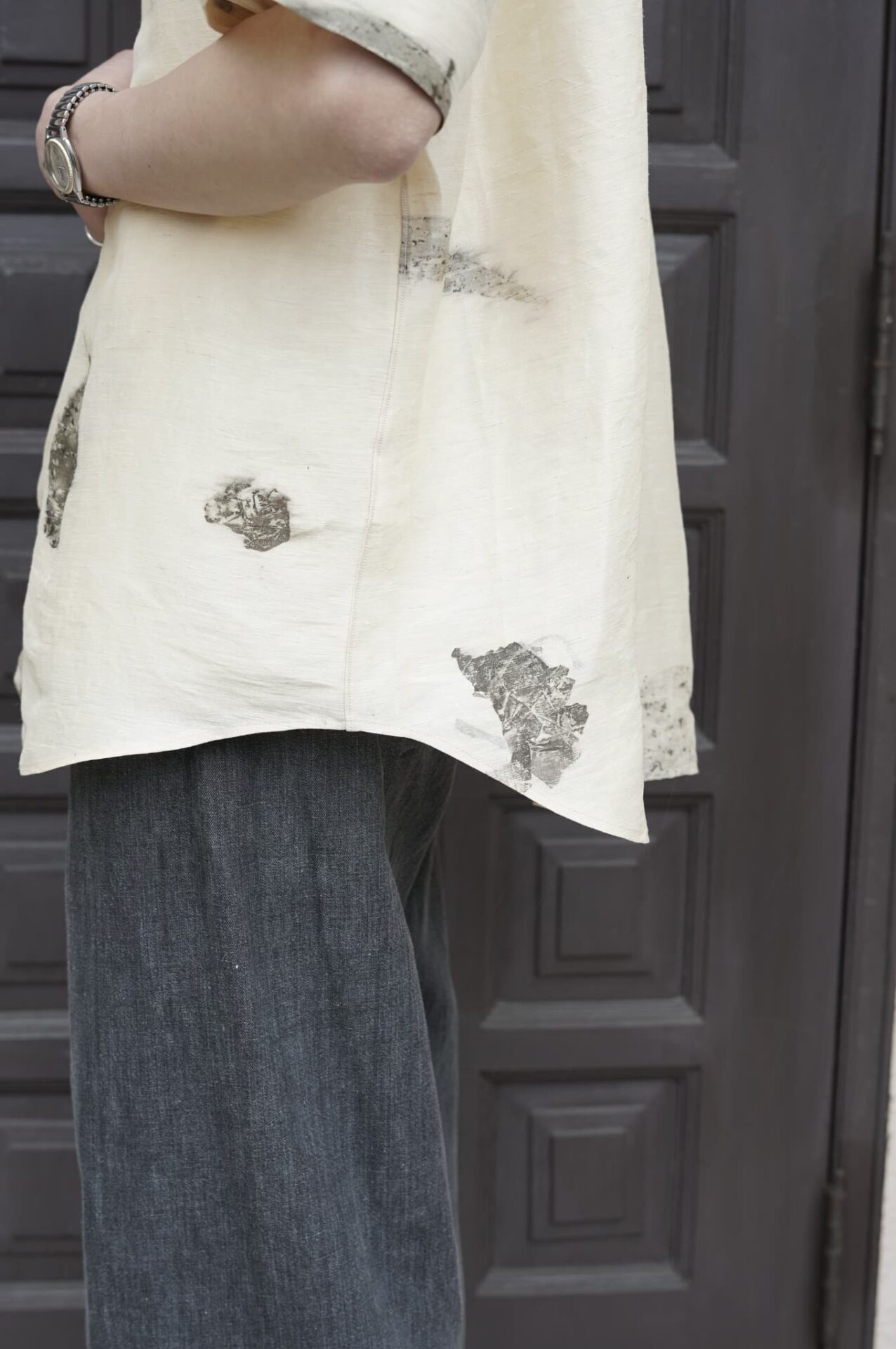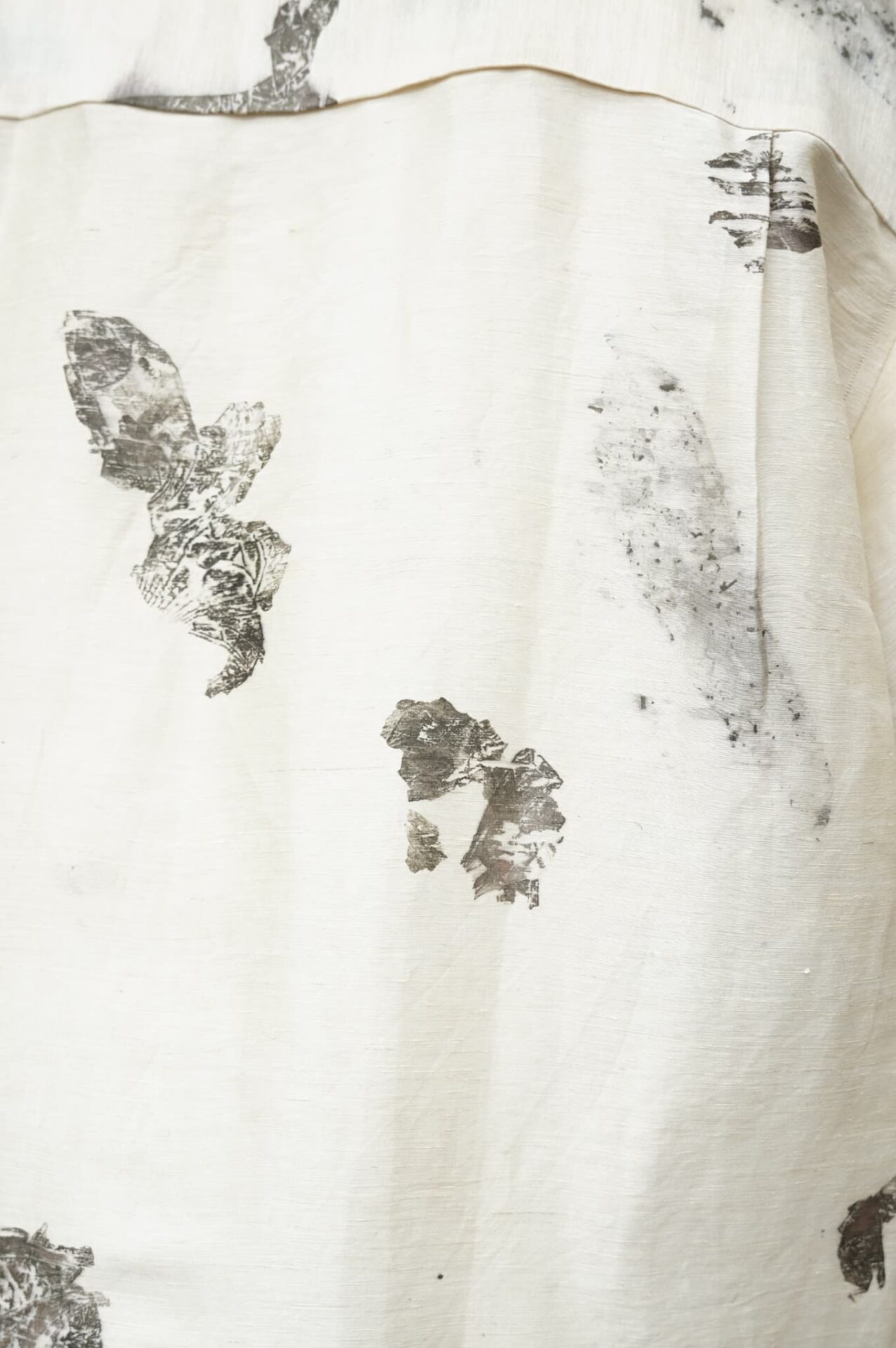 オリジナルで、インドにて6mずつ出来る手織りのリネンシルクの生地を作成し、そこにプリントを施しています。