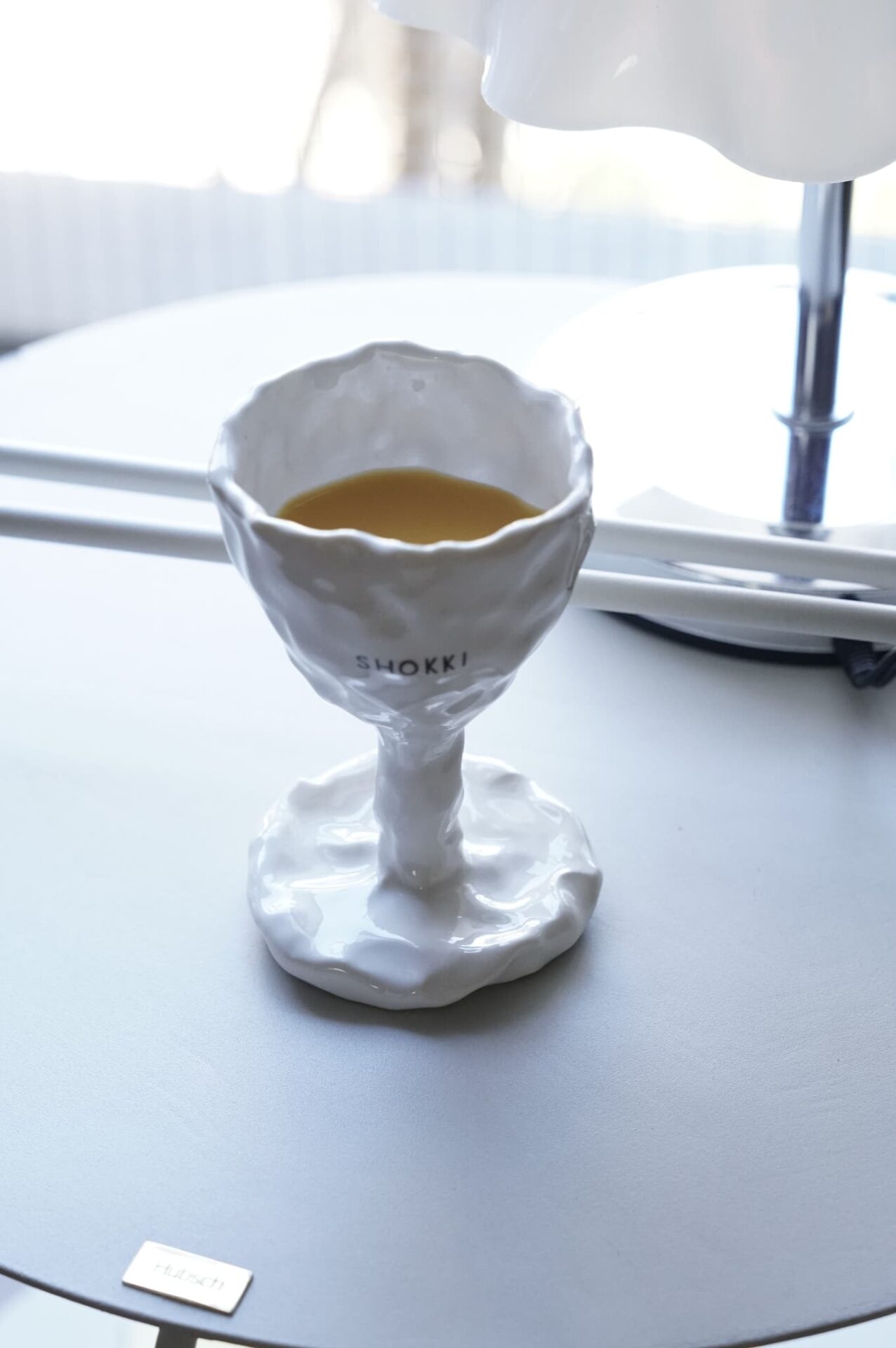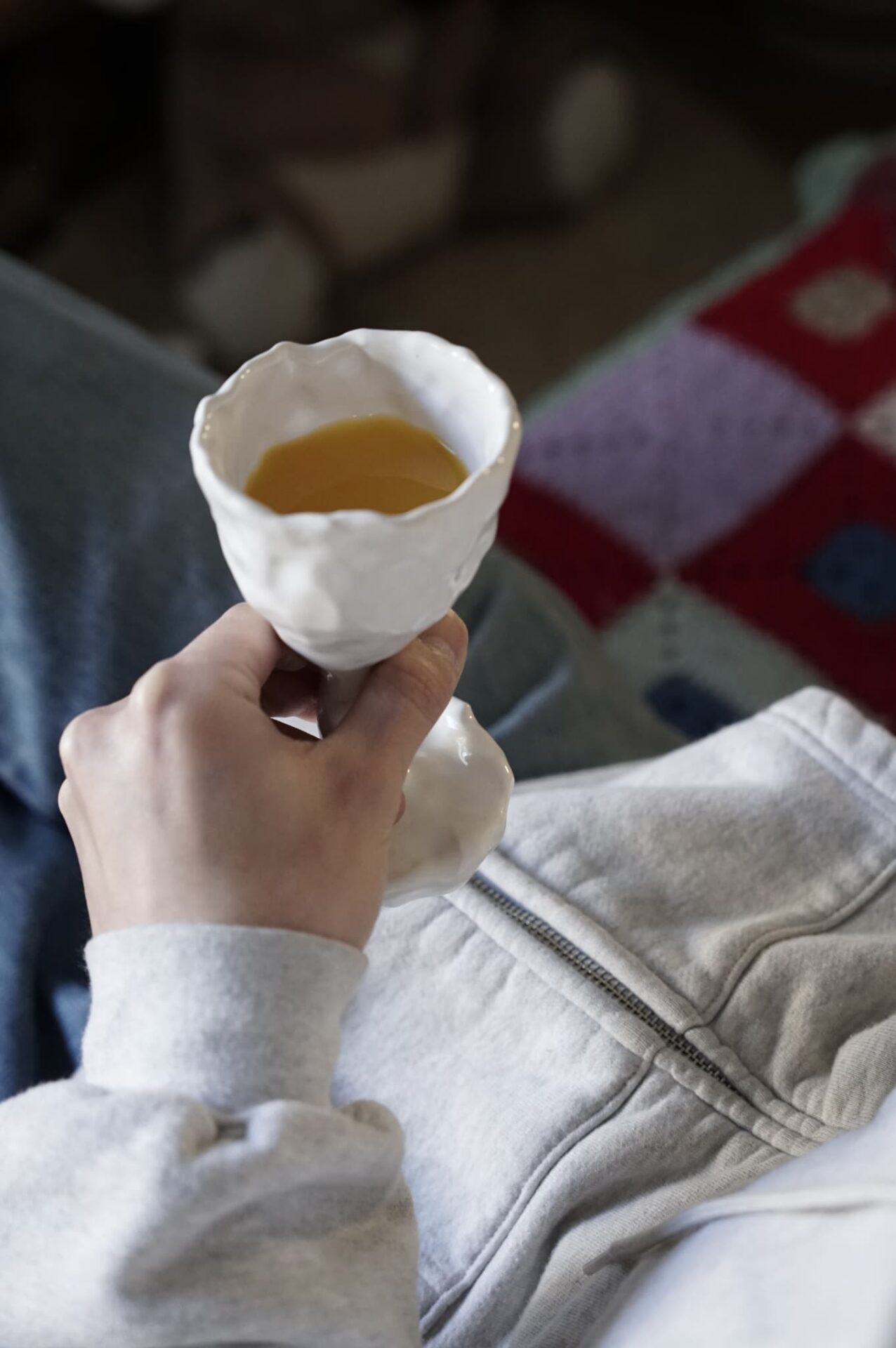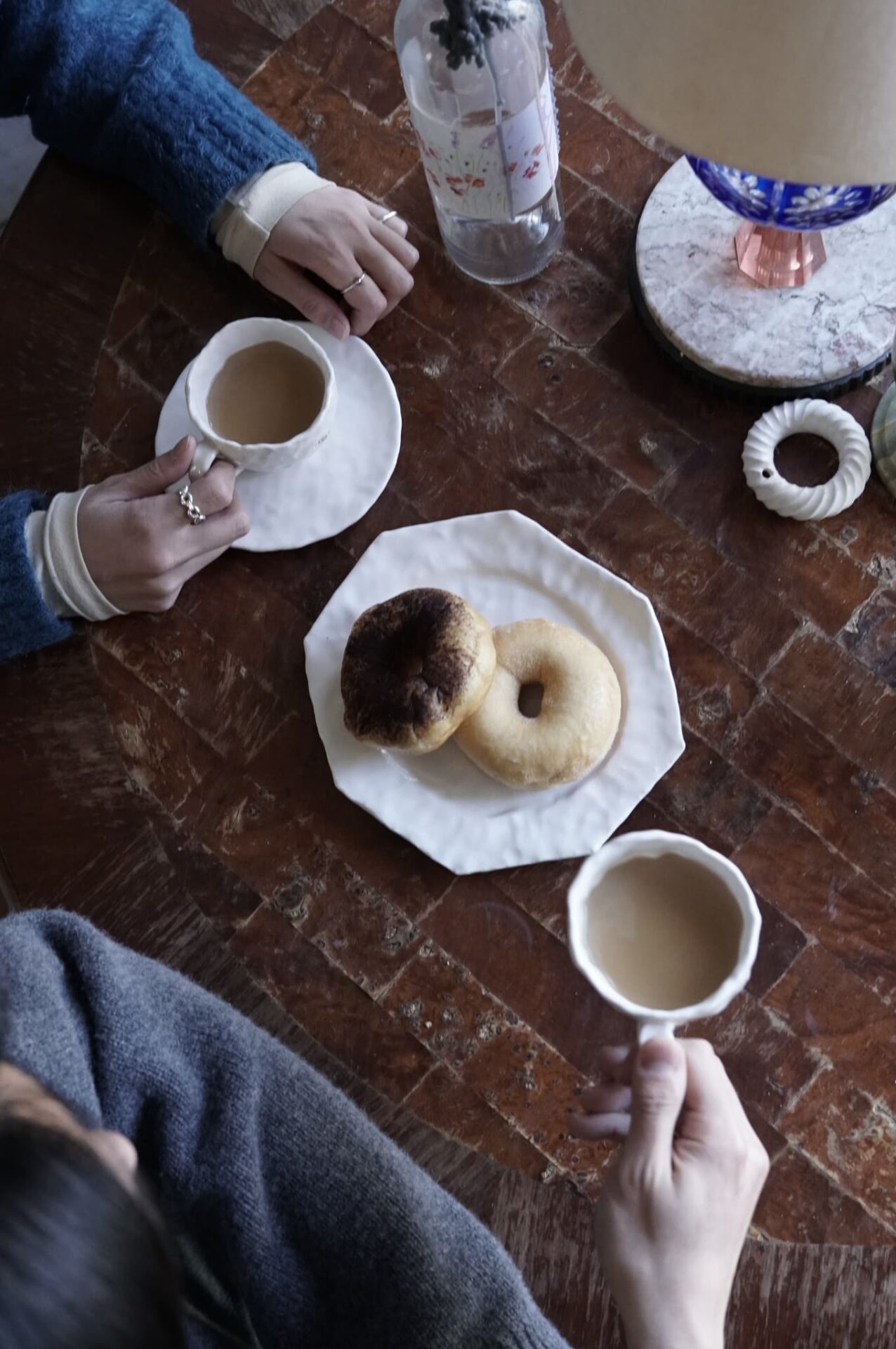 白だからこそ、自宅の机にもスッと馴染んで可愛く、飲み物や食べ物次第で、色んな見え方になる。
