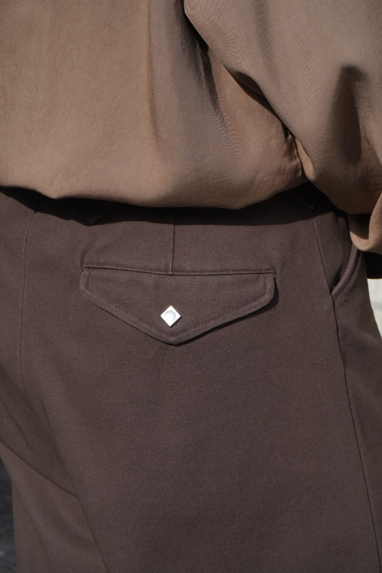 ワーク色が強過ぎないスッキリとさせたシルエットと細かくて美しい縫製、そしてバックポケットのパールボタン。