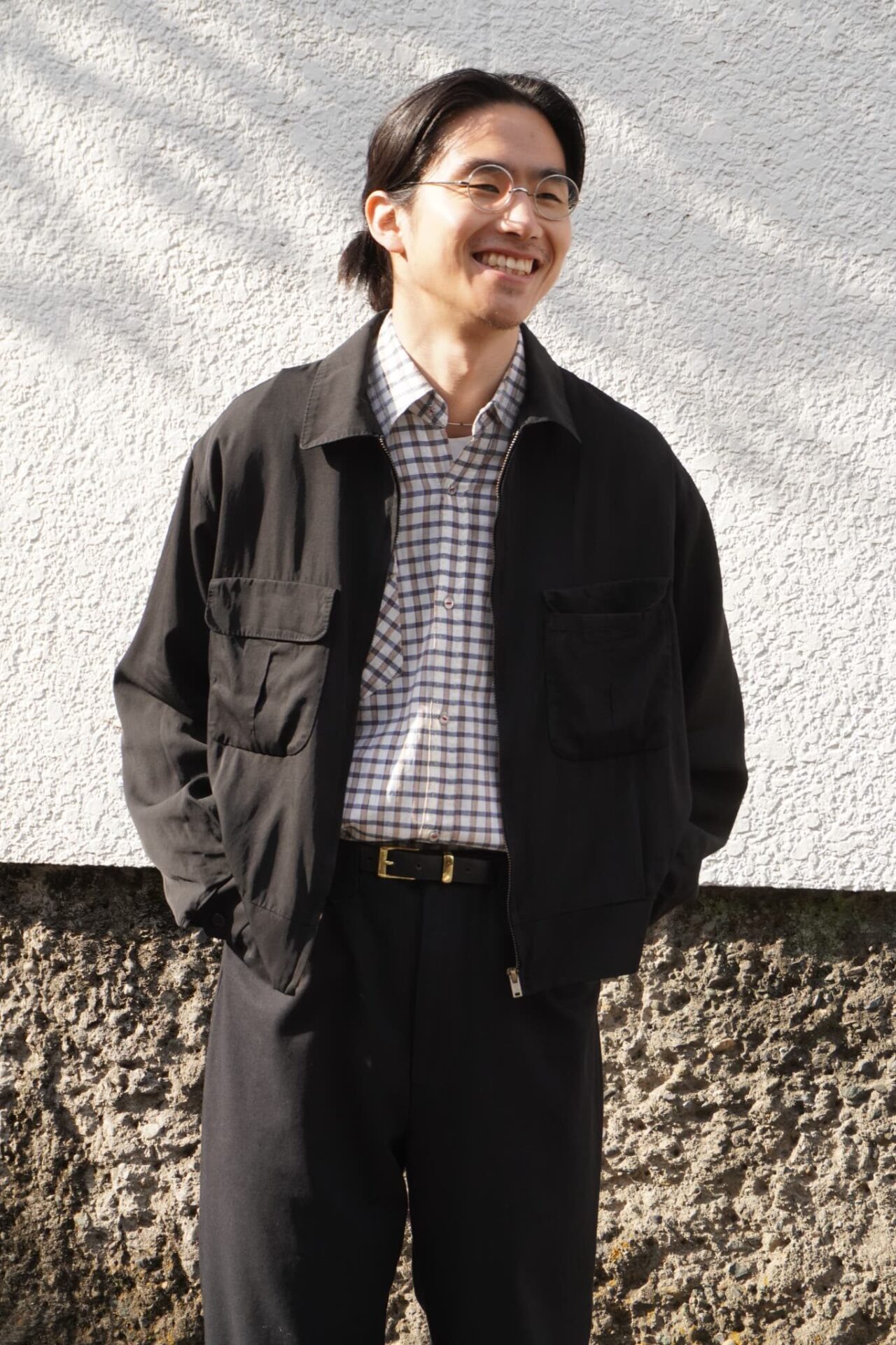 細身のスラックス、ブルゾンにシャツでタイアップ。