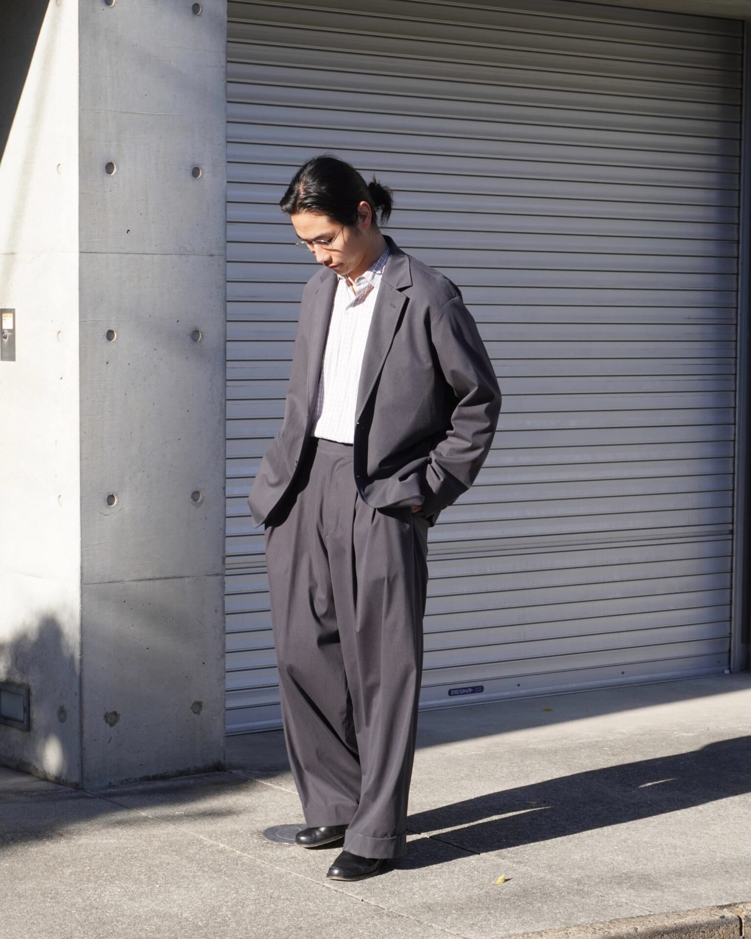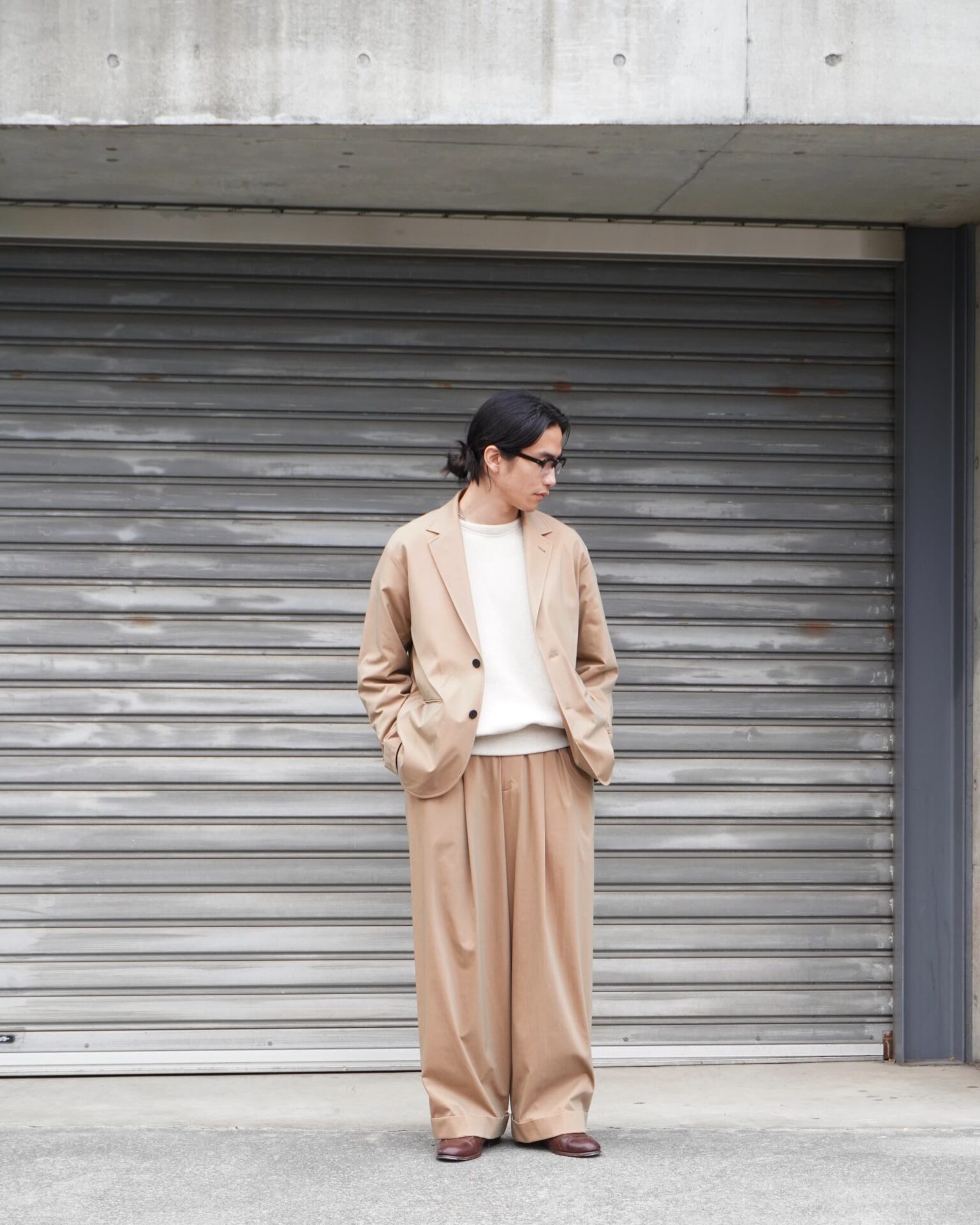この日は寒すぎるがゆえにスウェットを合わせましたが、春先は薄手のシャツをタックインして着たいなあ〜と想像が膨らむ撮影でした。