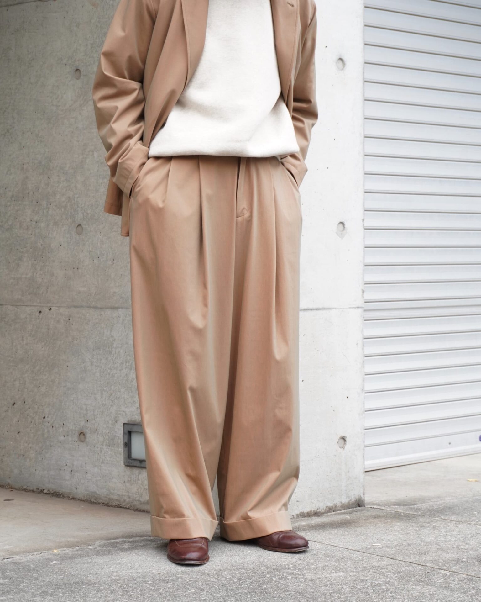 パンツの方も高級感のある生地がより活きるよう全体的に太めのシルエットを採用。