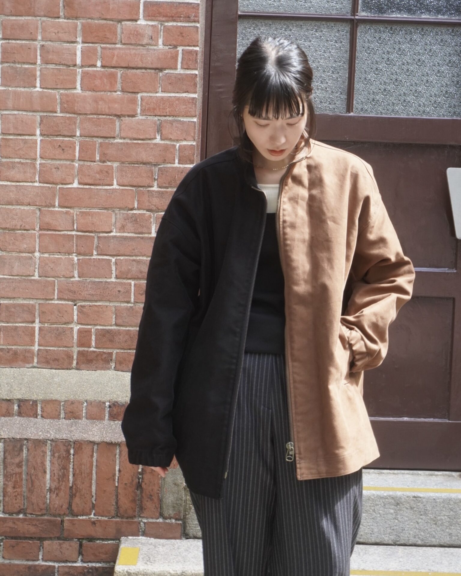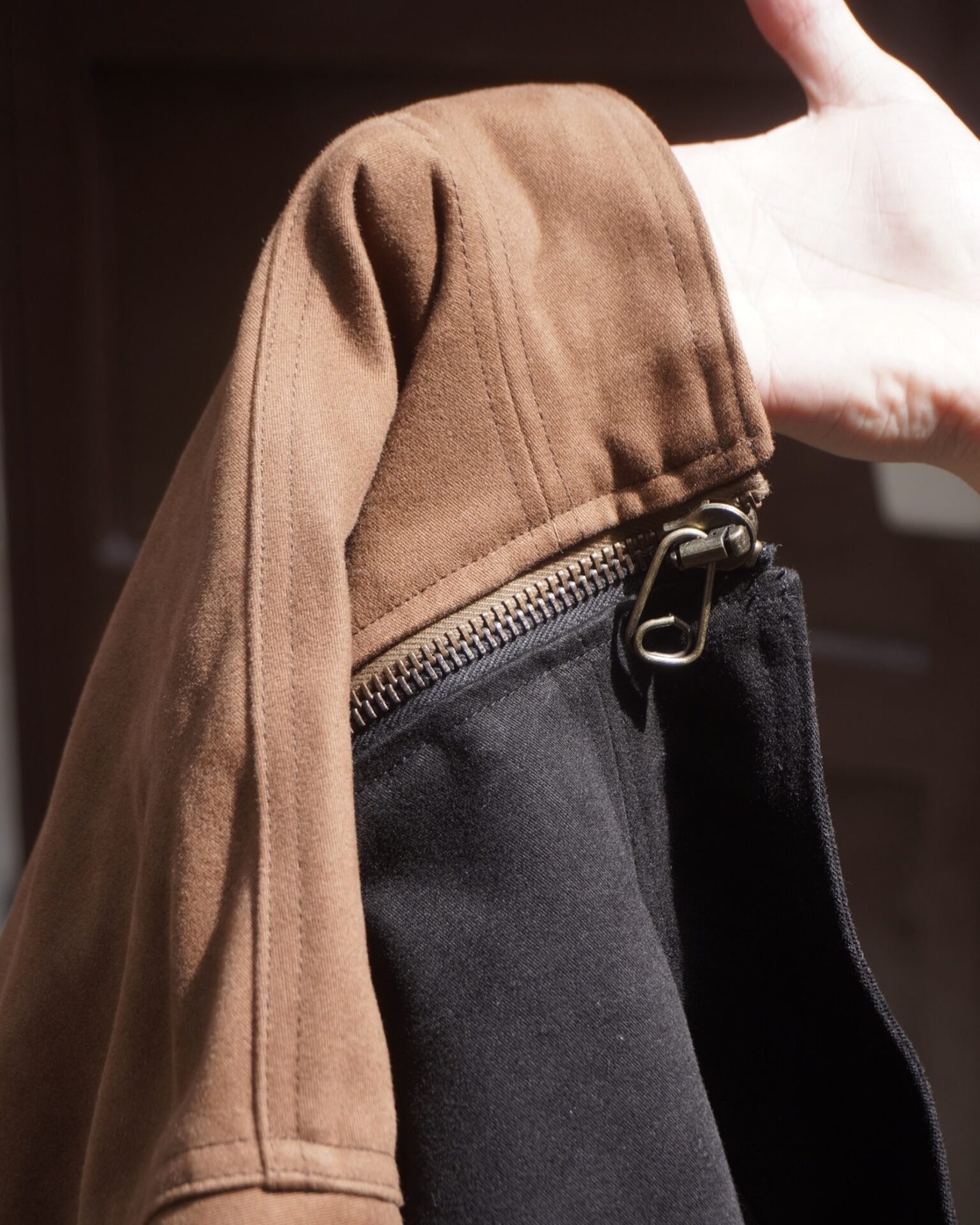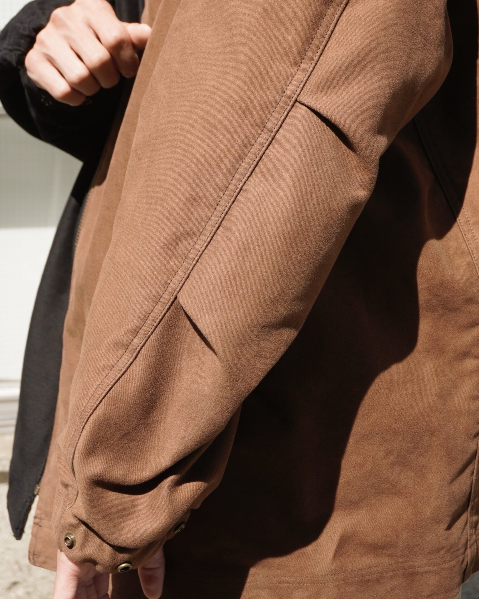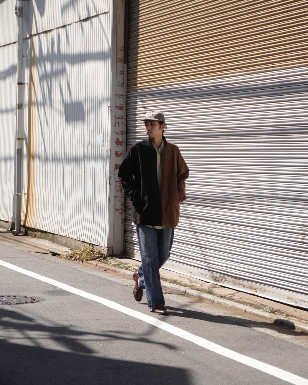 極厚コットンモールスキンに起毛加工を施した、土臭さを感じさせながらもベルベットのようなこの生地感のバランスに惹かれて。