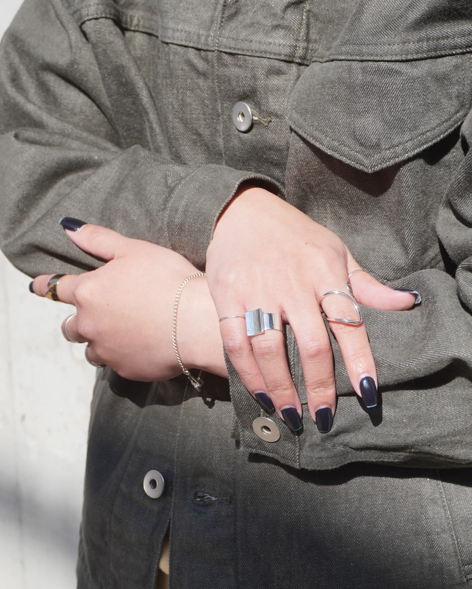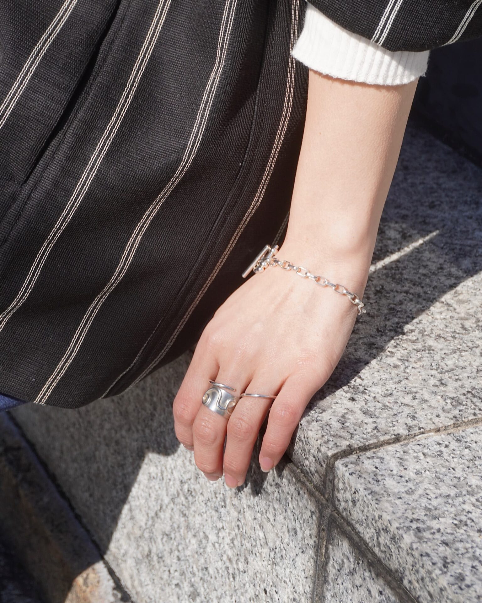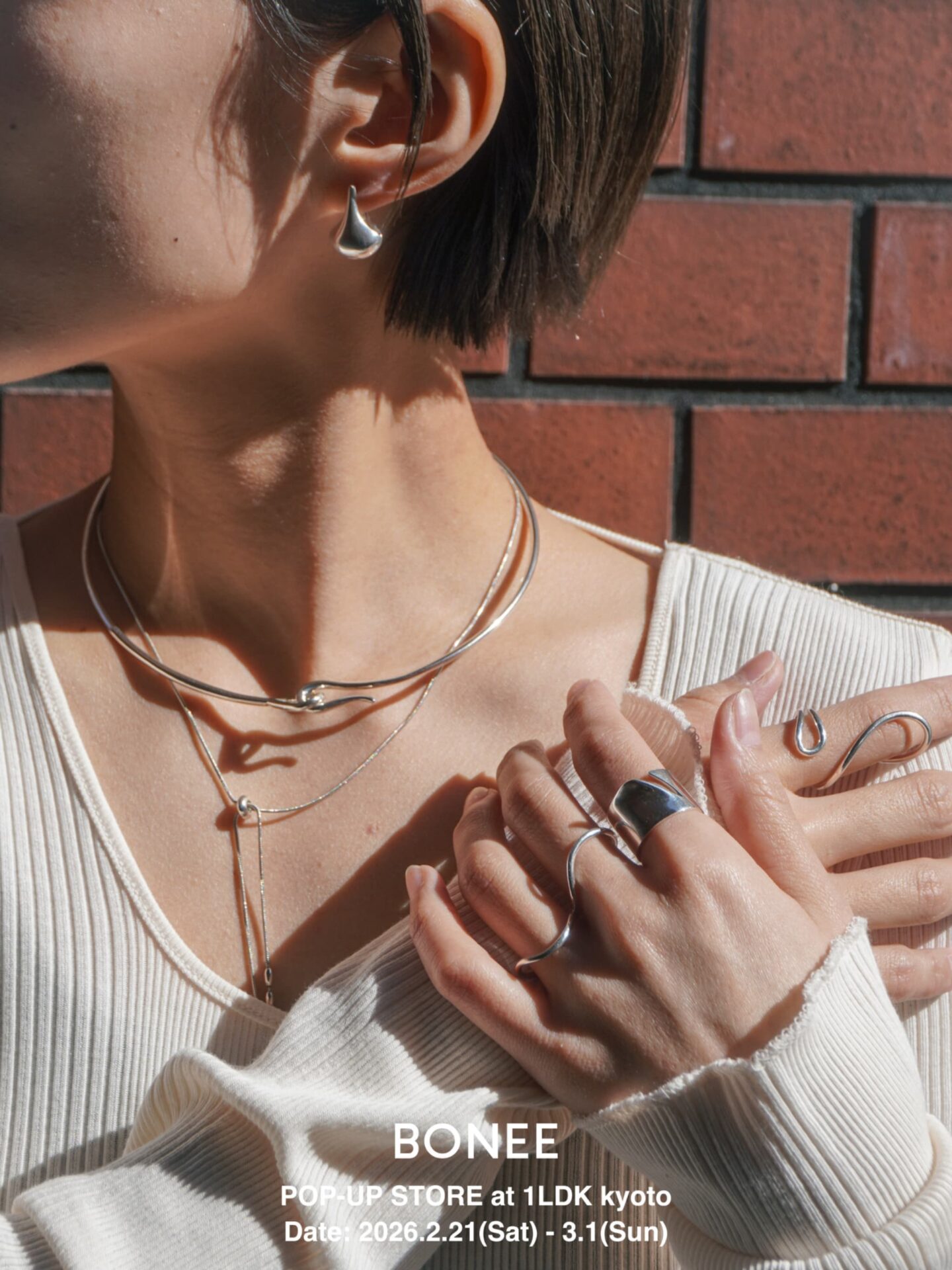 ひとつでも完成するBONEEのジュエリーも、重ねることでより立体的な表情が生まれます。