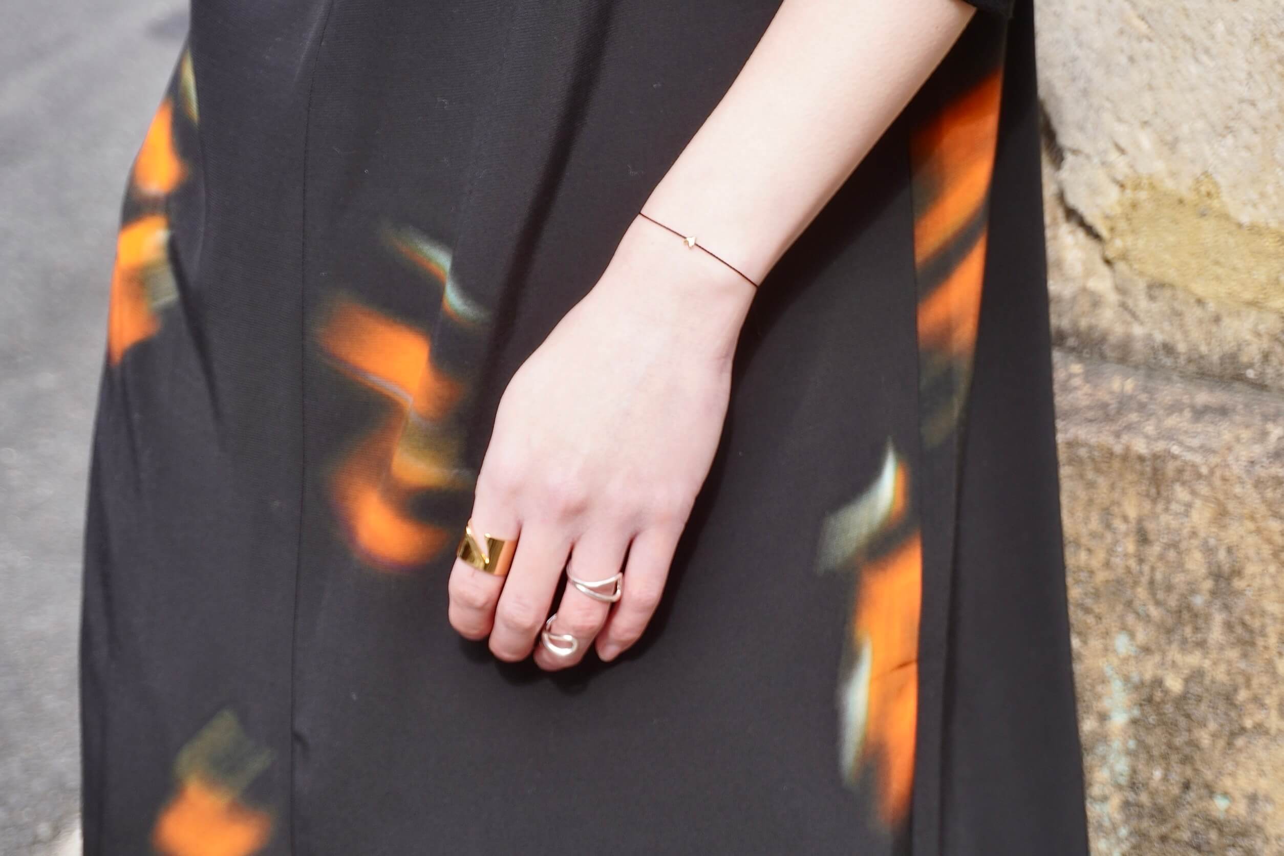 丸みのあるリングに、少しエッジのあるものを重ねる。