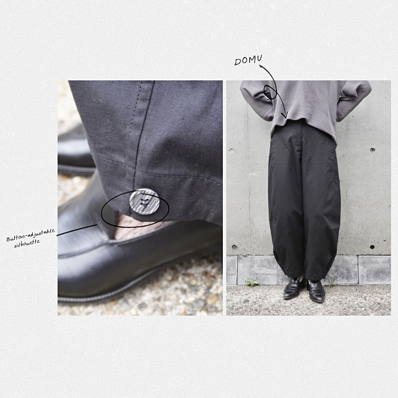 続く”DOMU”は、たっぷりとした分量感と丸みのあるフォルムが特徴で、裾のボタンでシルエットを変えられる一本。着こなしに合わせてわずかに調整できる、気の利いたさりげなさも魅力です。