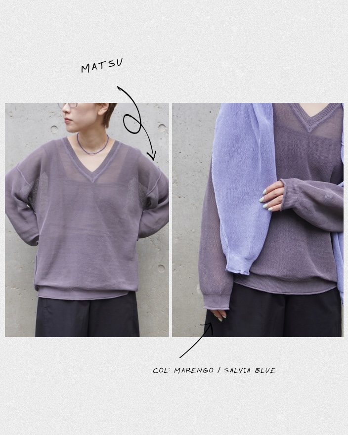 ”MATSU”は、やわらかく肌に沿う質感と、すっと開いたネックラインが印象的な一着。
