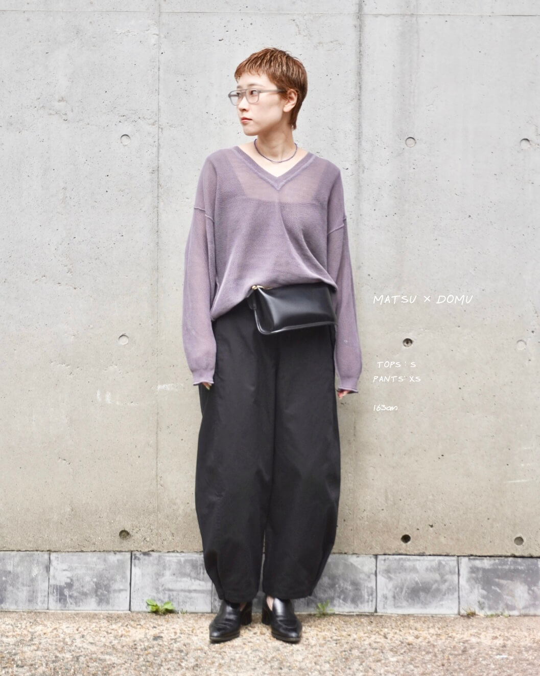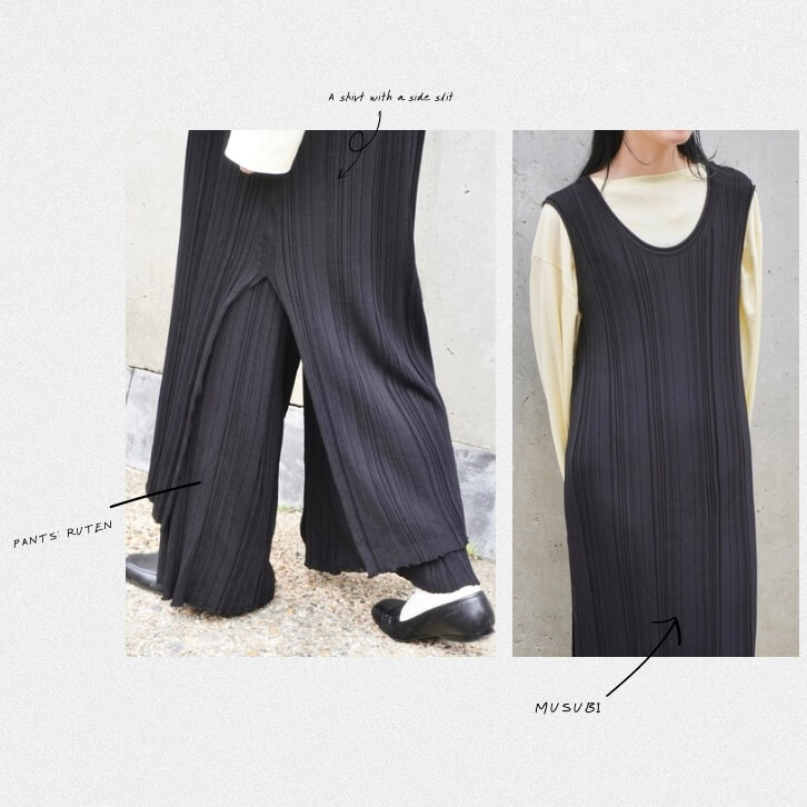 同じラインの”RUTEN”と組み合わせると、落ち着いたストレートシルエットと”MUSUBI”の揺れが重なり、自然な動きと奥行きが生まれます。形の違いが互いを引き立て、セットで着る楽しさも感じられる組み合わせです。