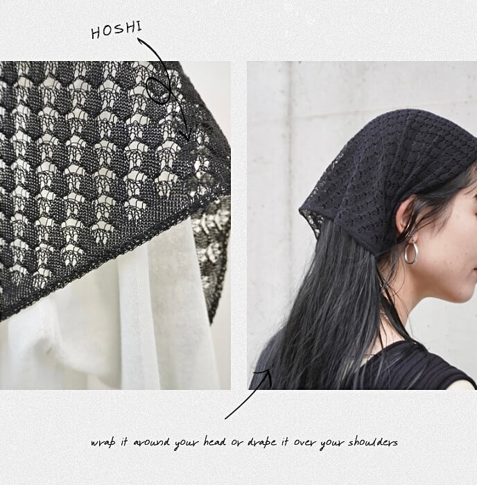 ”HOSHI”は、繊細な編み地で軽やかに仕上げられたアイテム。頭に巻いたり肩にかけたりとスタイルにアクセントを加え、着こなしに抜け感を添えてくれます。