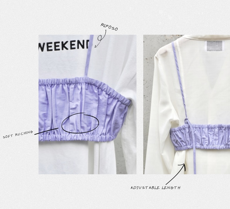 ”RIPOSO”は、アクセサリー感覚で取り入れられるレイヤードアイテム。さりげなく入ったギャザーがアクセントになり、重ねるだけで着こなしに程良い変化を生み出します。