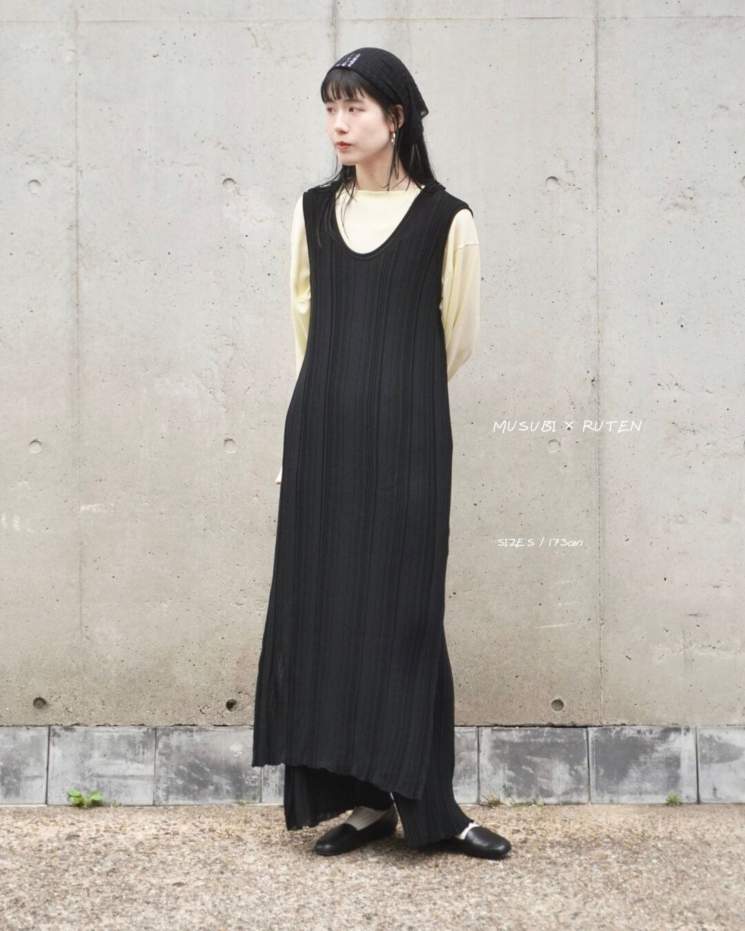 ”MUSUBI”は、すとんと落ちるシルエットにサイドスリットを配したワンピース。