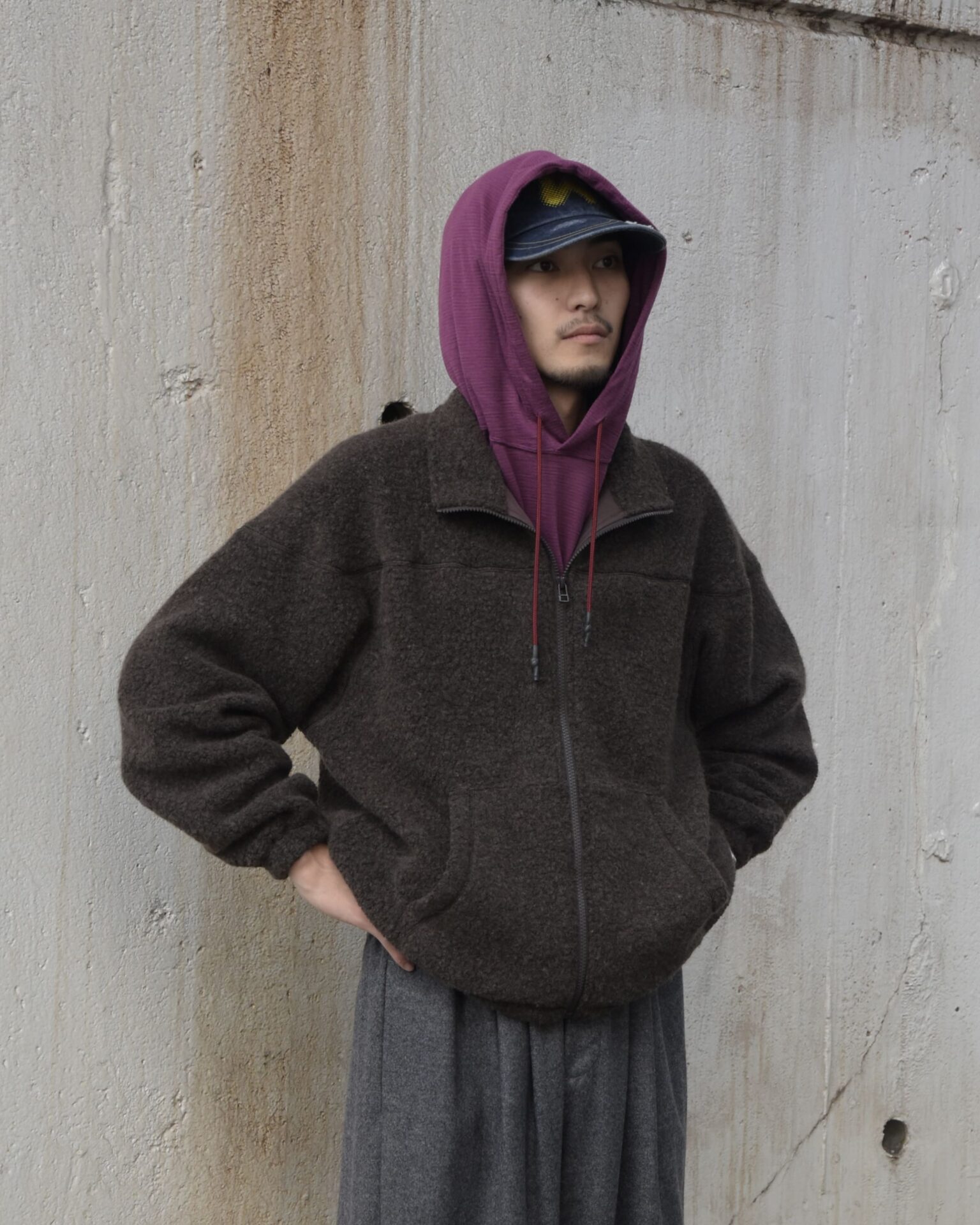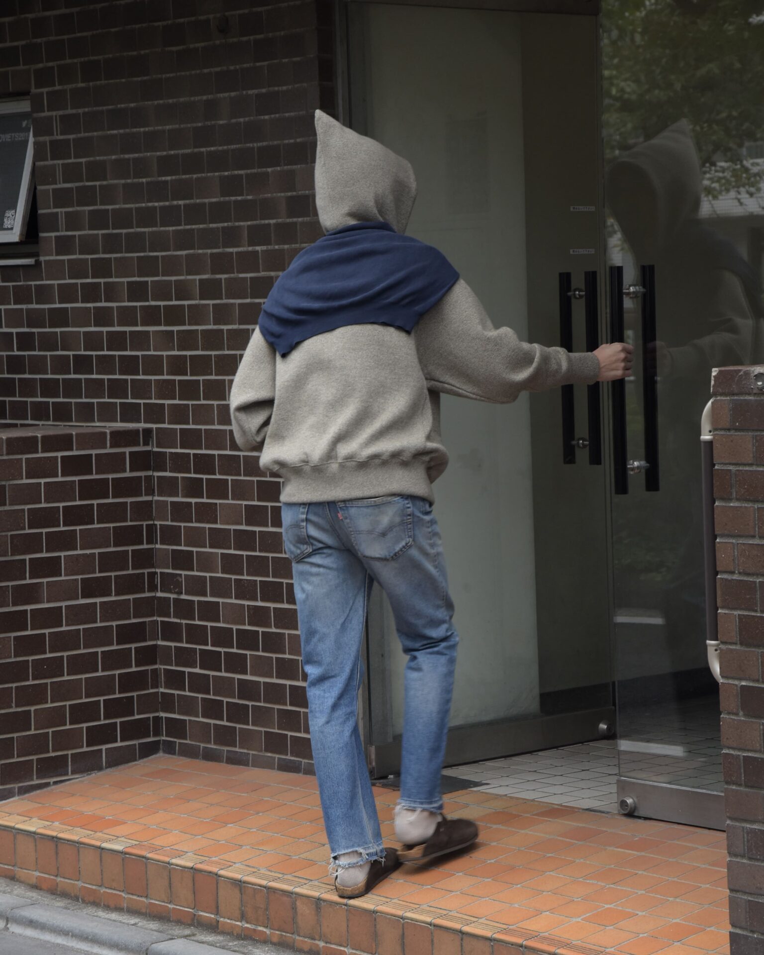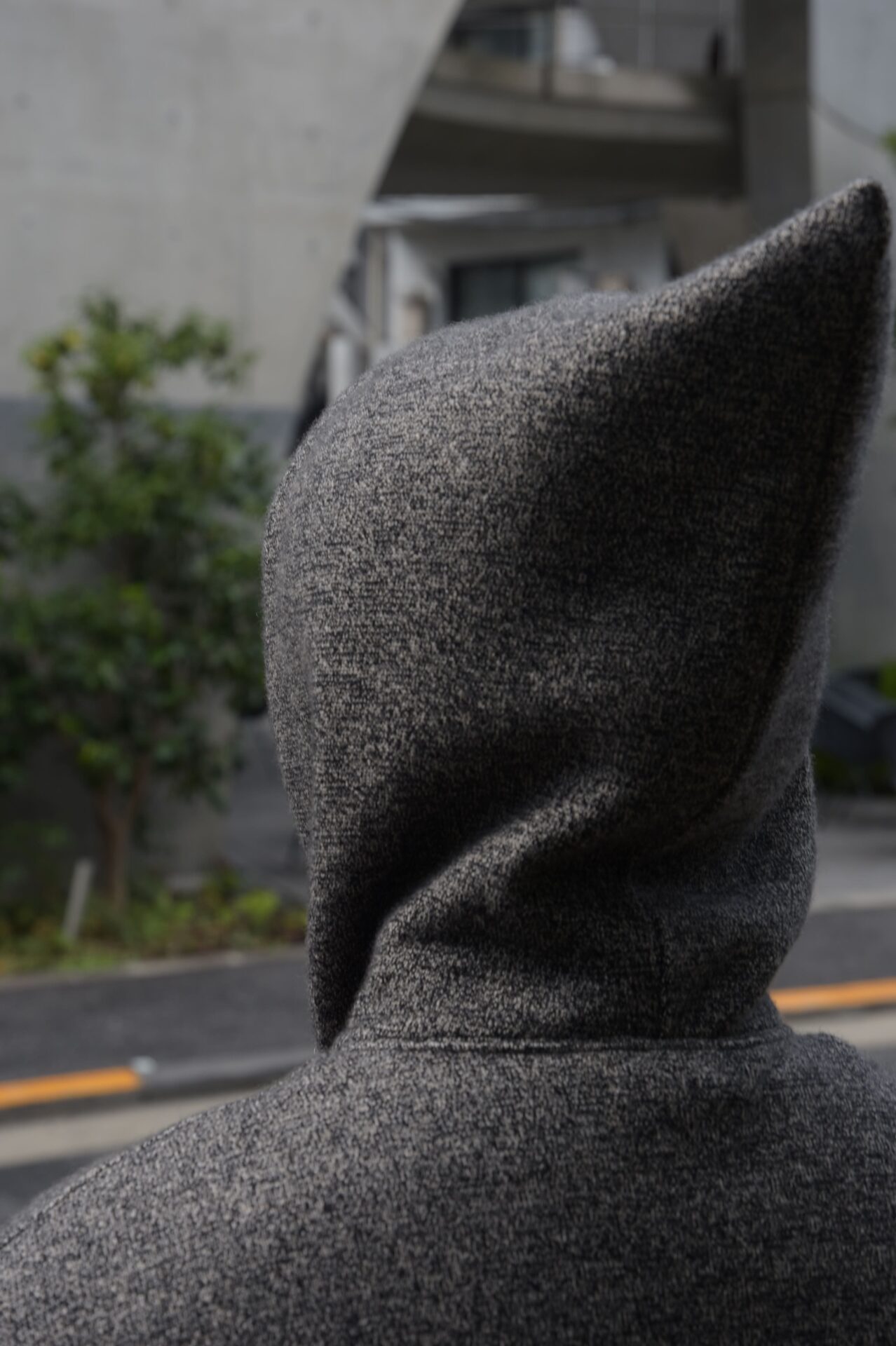 あんまり僕は信じていないですが、簡易な裁断だったが故に先が尖り、こんなユーモアのある形として知られていくこのフードが可愛らしく、仮にブルゾンを羽織ったとしても大胆に頭をのぞかせてくれるだろうという期待にすら応えてくれる安心感。