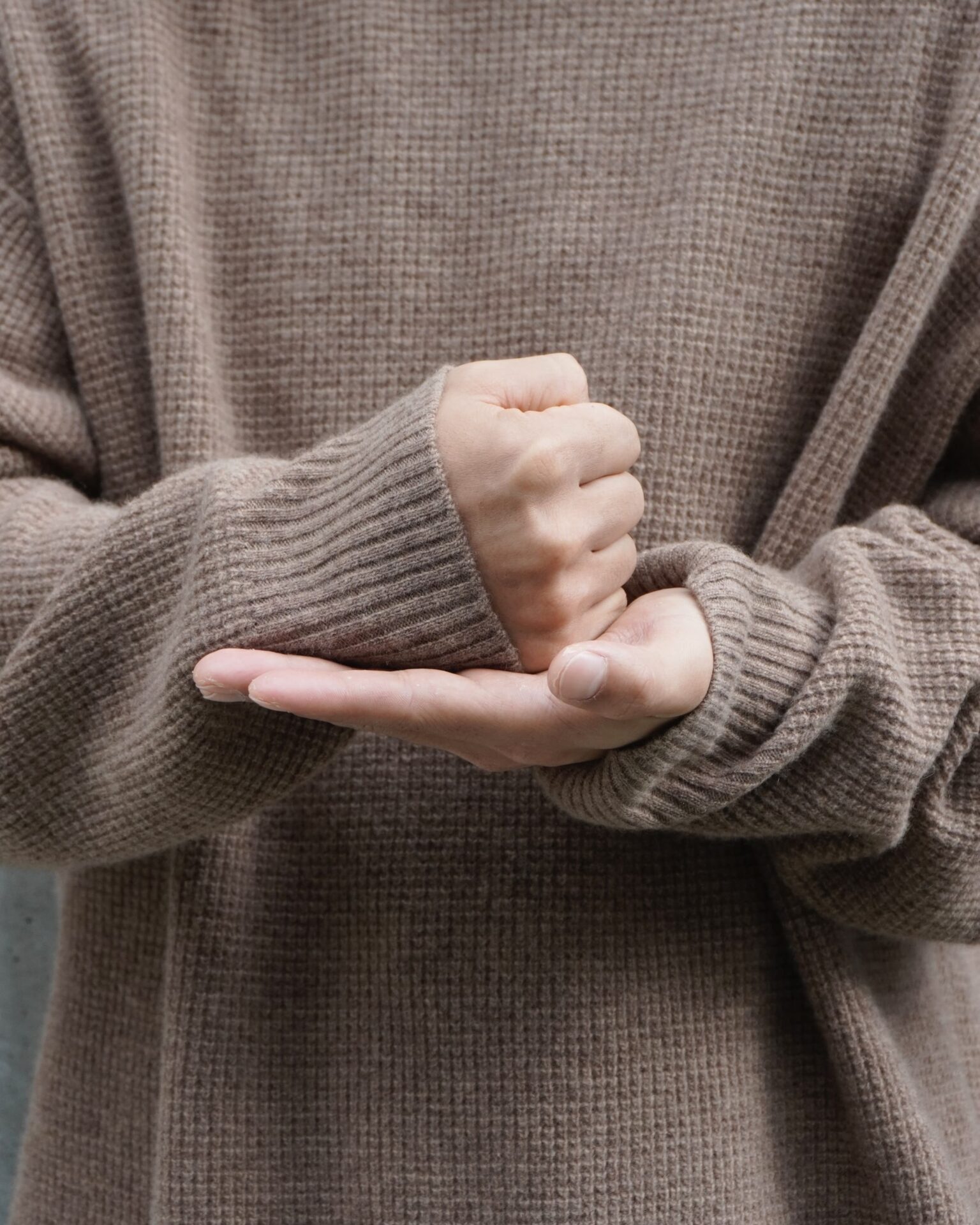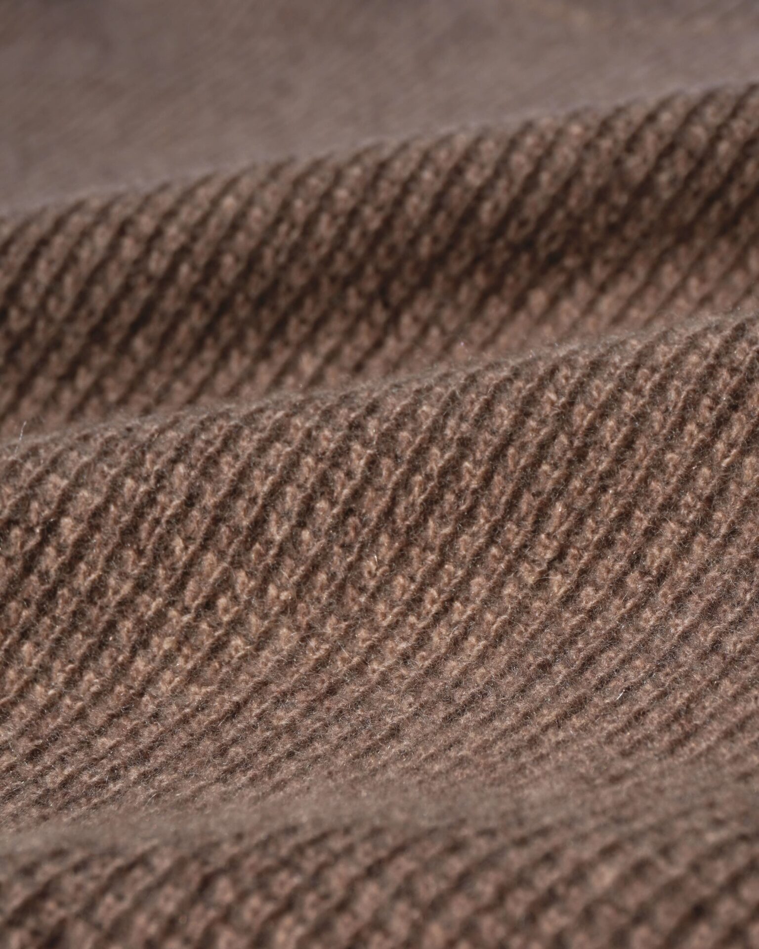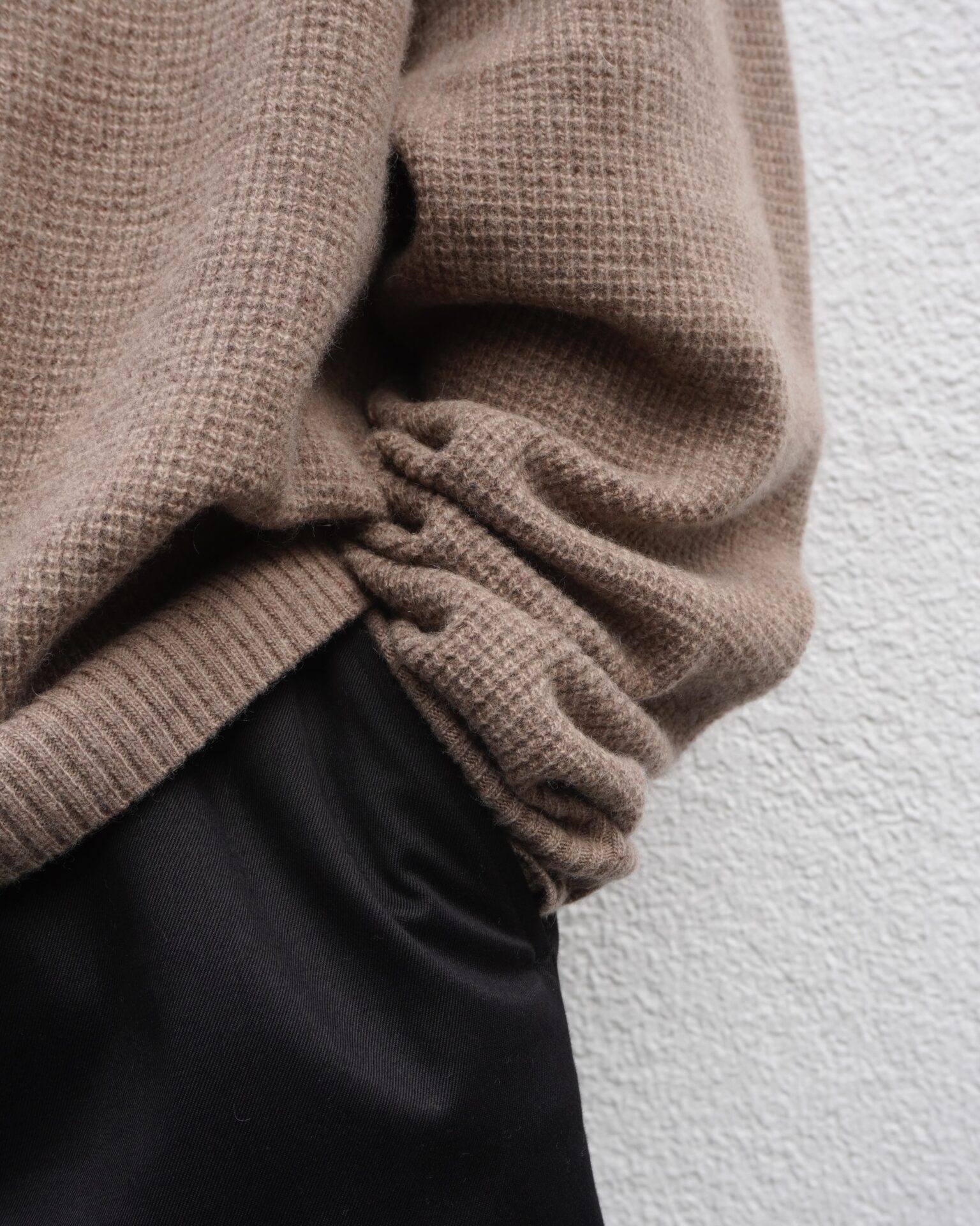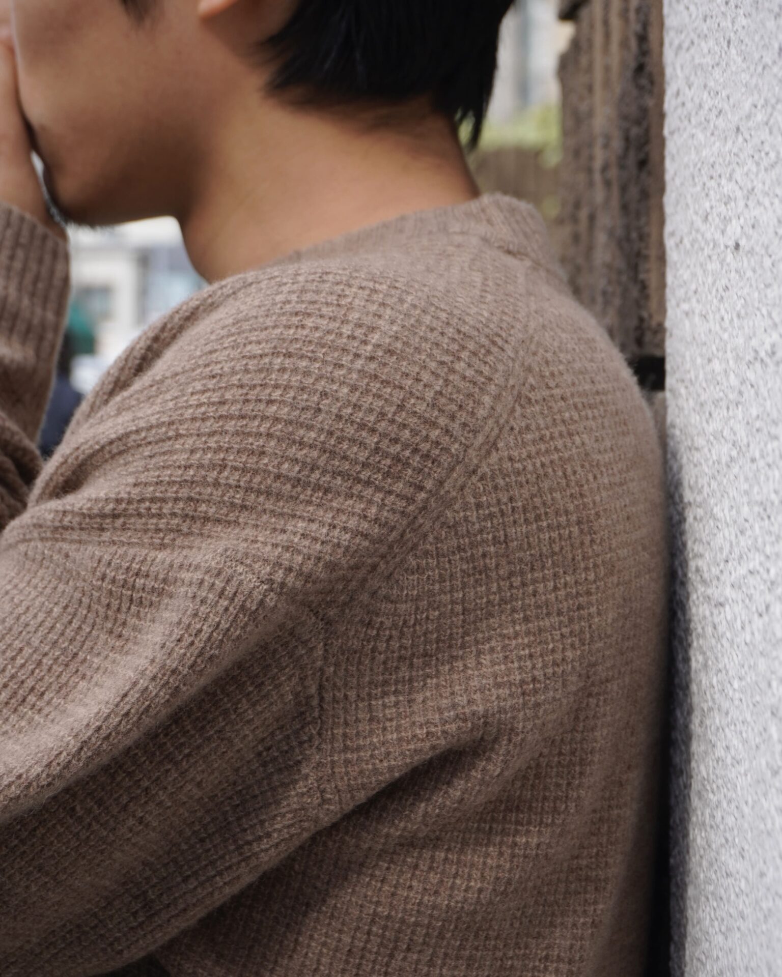 着続けていくと、ねじって編み込まれた生地感は無機質でのぺっとしたものから奥行きのある柔らかい表情へと変わり、着用するほどに空気を含み、ふわっとしたカシミヤ本来の姿に成長を遂げます。