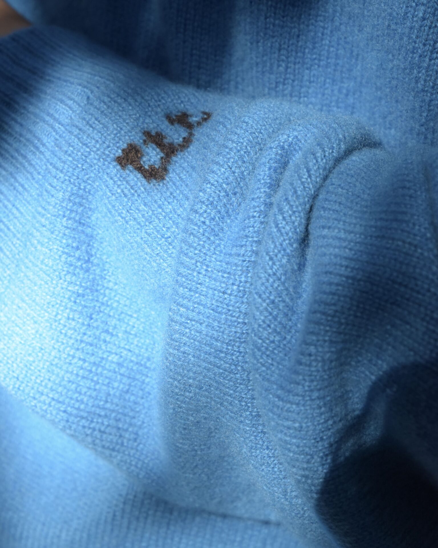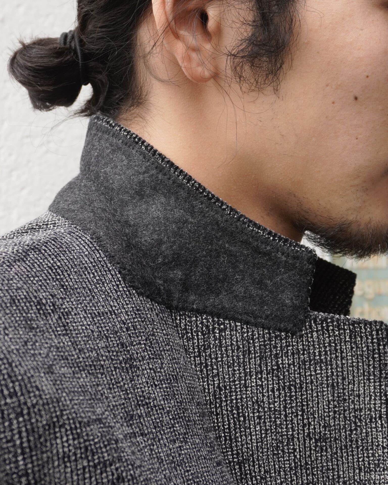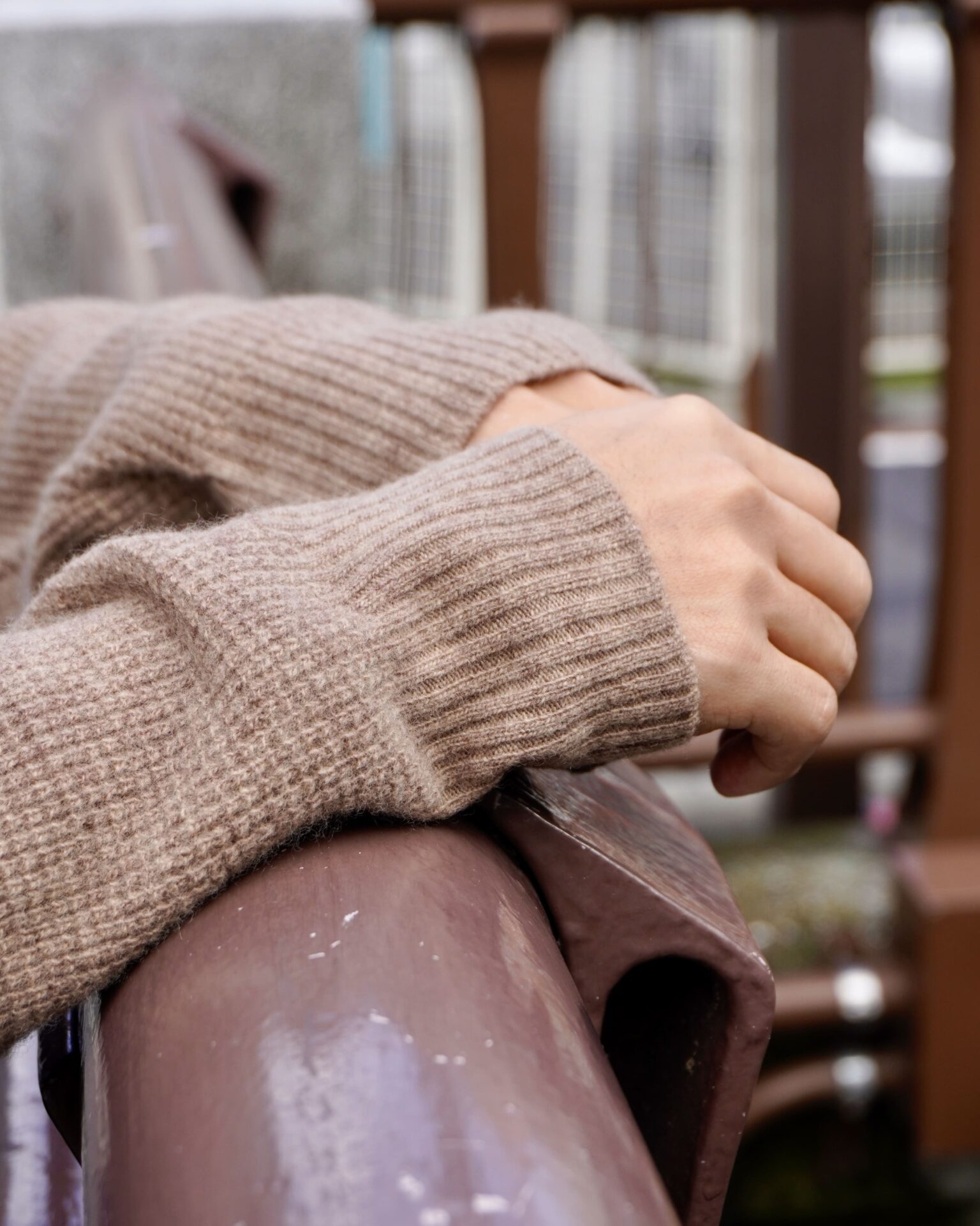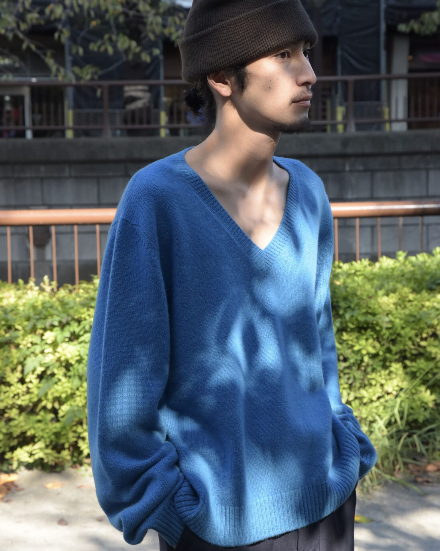 着続けていくと、ねじって編み込まれた生地感は無機質でのぺっとしたものから奥行きのある柔らかい表情へと変わり、着用するほどに空気を含み、ふわっとしたカシミヤ本来の姿に成長を遂げます。