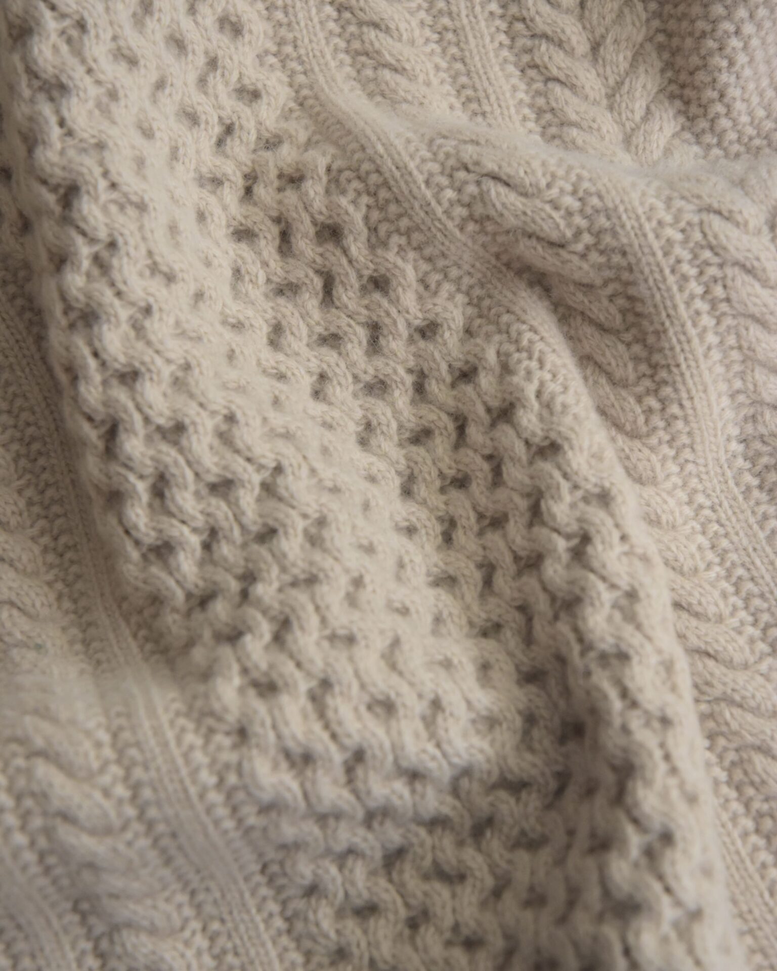 「ワッフルニット」という言葉は、“waffle”(ワッフル)=焼き菓子と、“knit”(ニット)=編み物という二語から構成されます。生地の表面がまるでワッフルのように凸凹していることからこの名が付きました。
