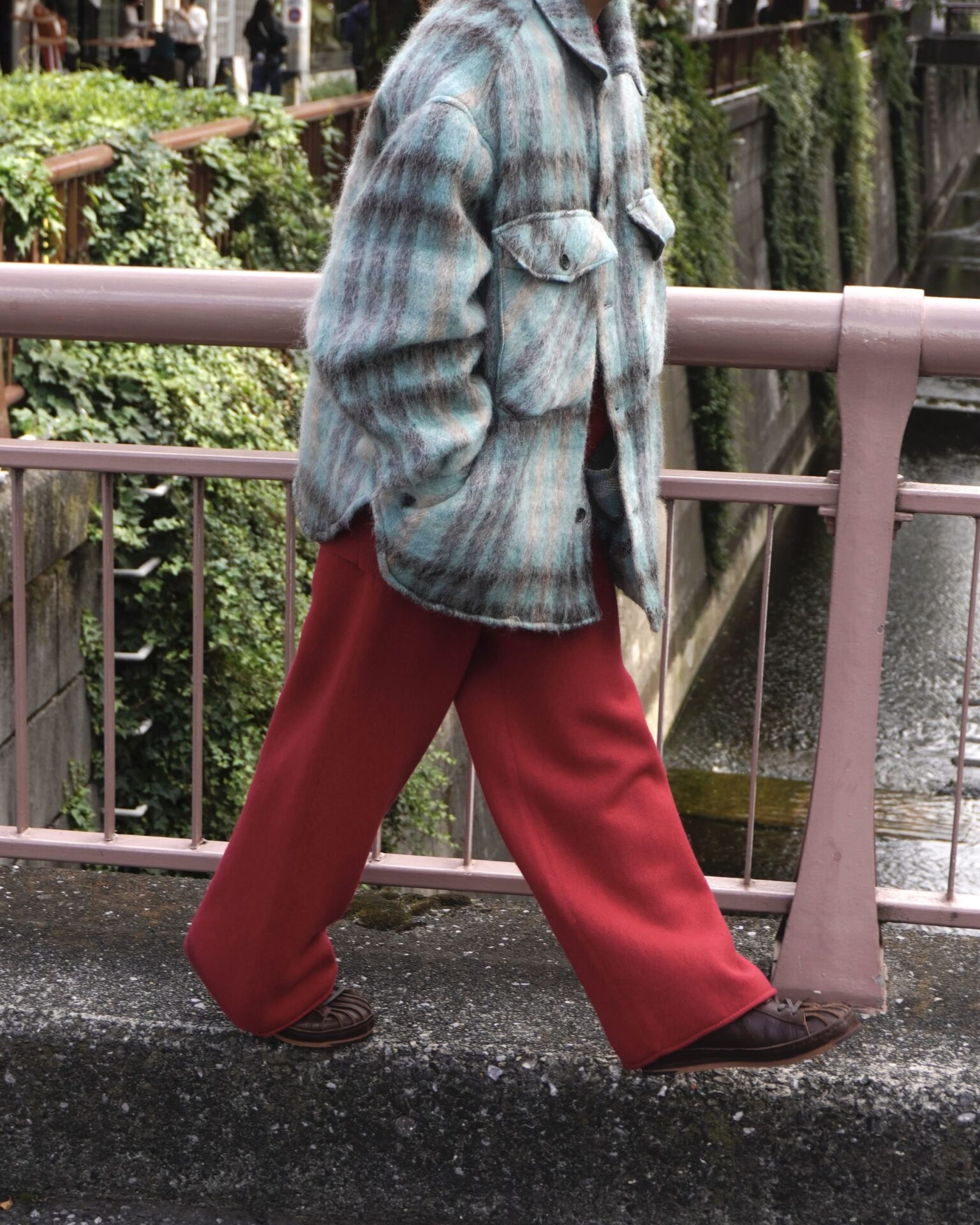 真っ赤なフェルトの上下に合わせても街に馴染んでくれる。