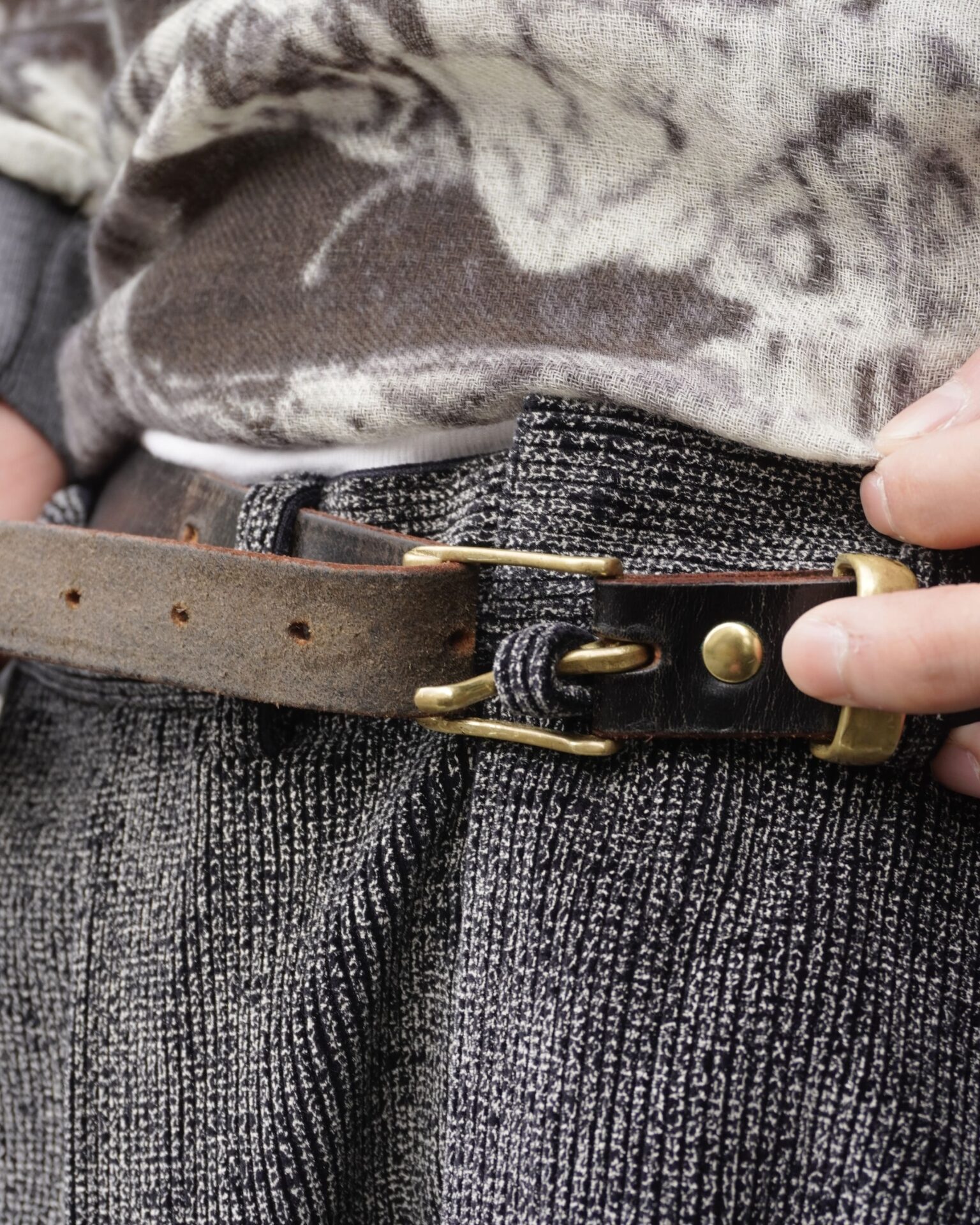 ウエストは広めなので、ベルトで絞って穿いていただけます。