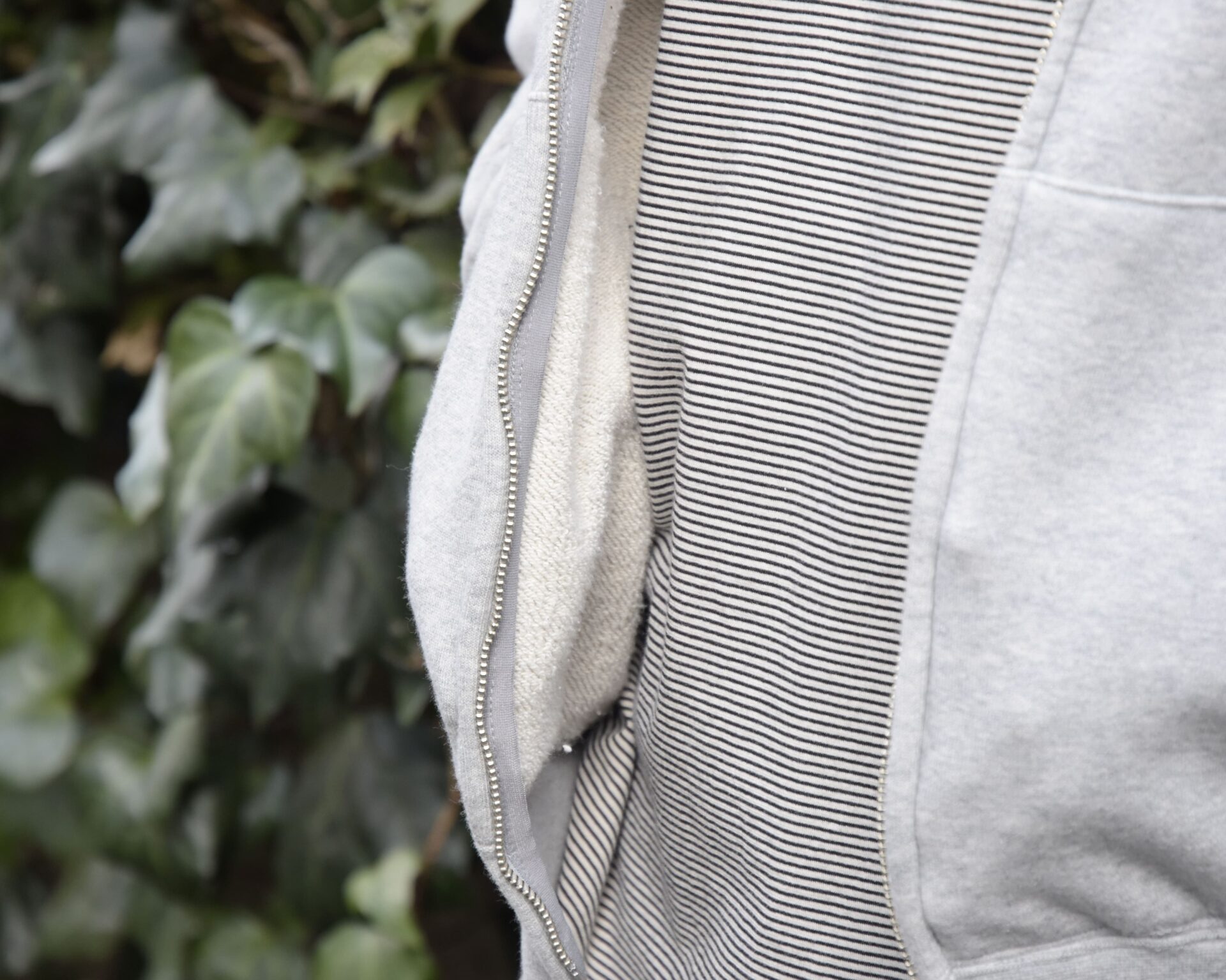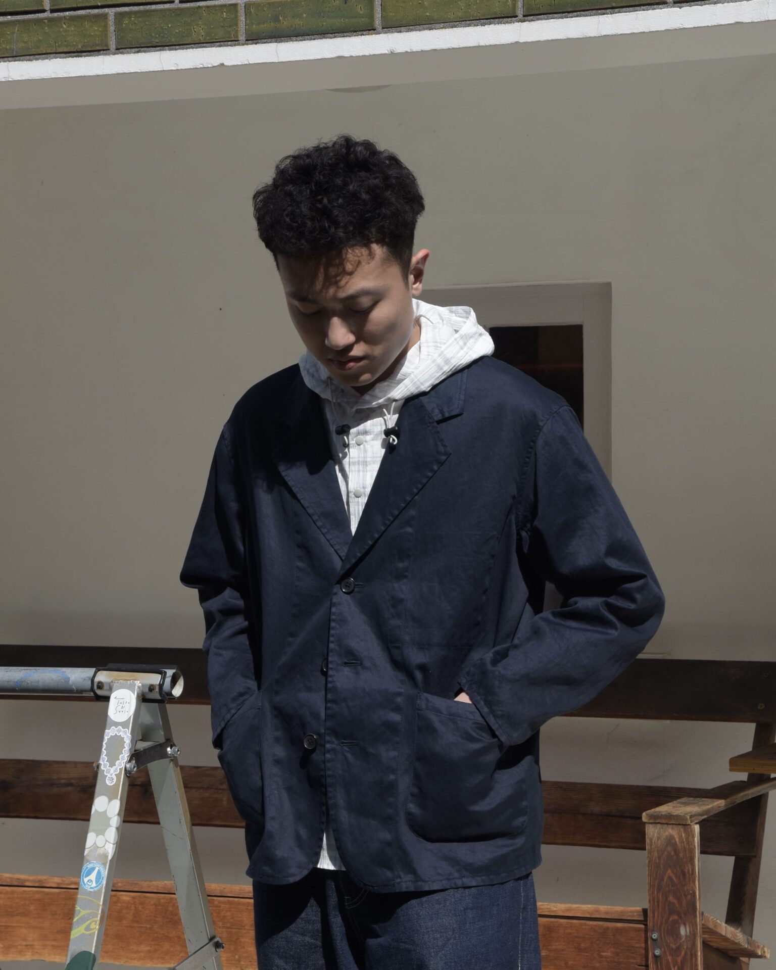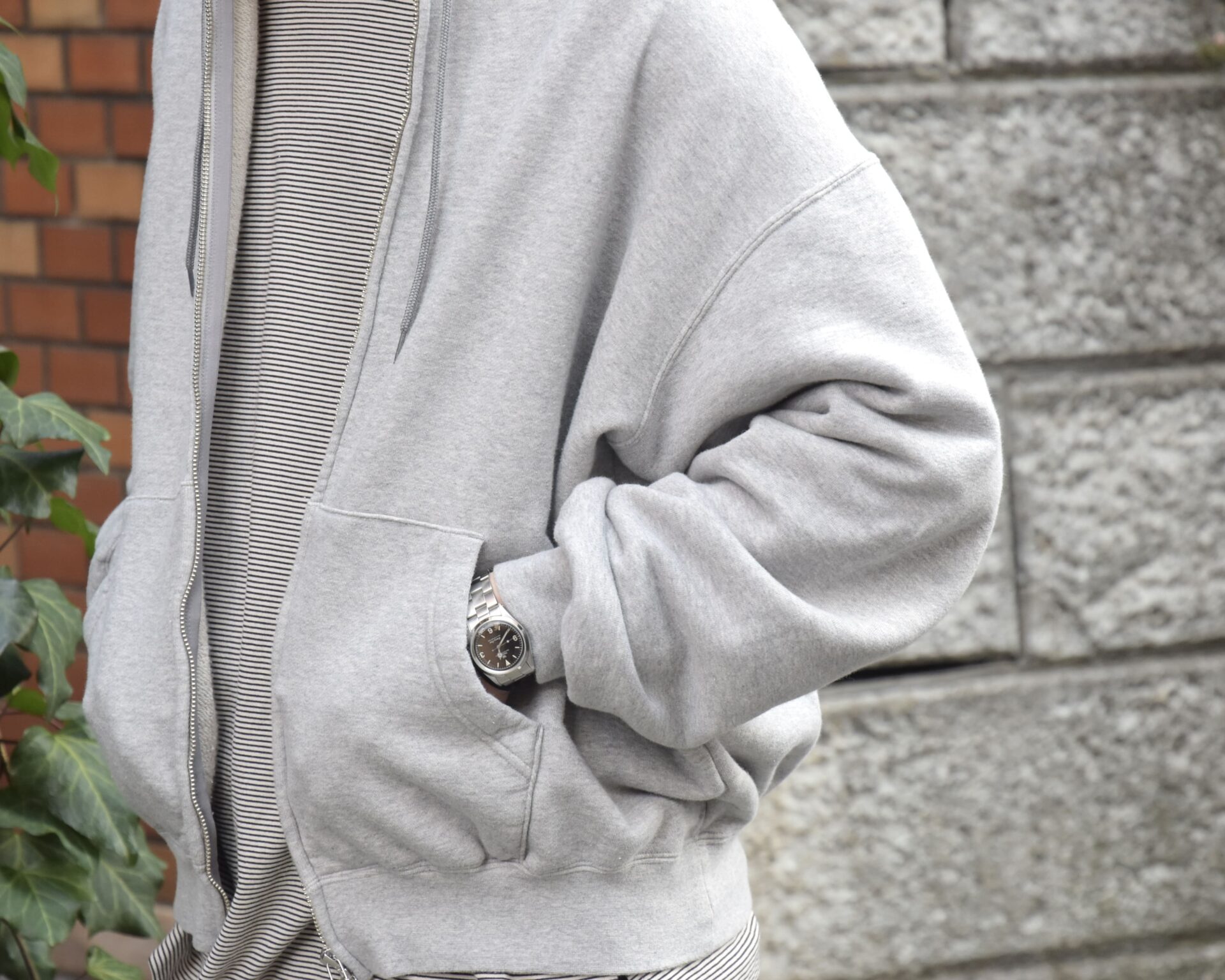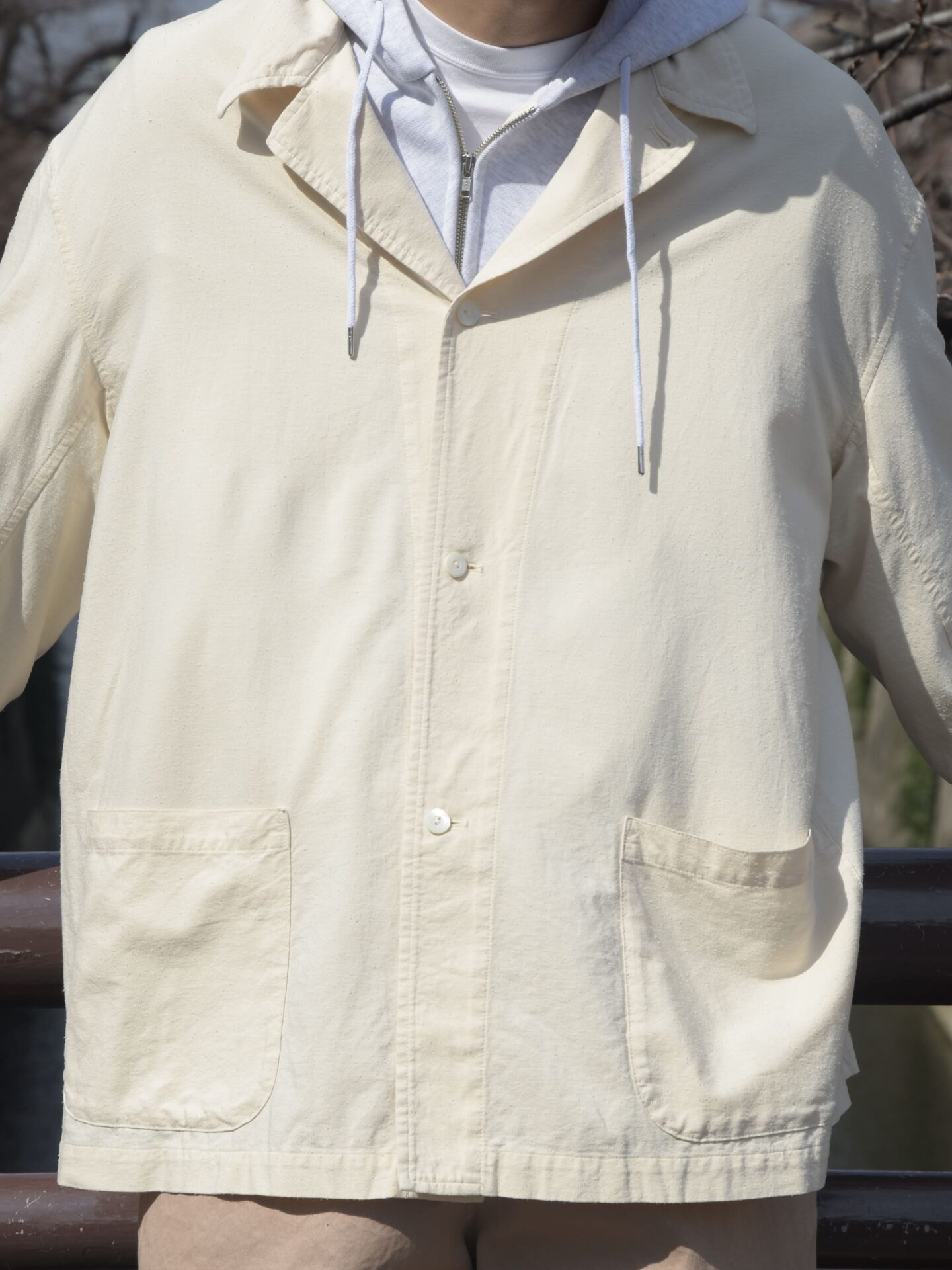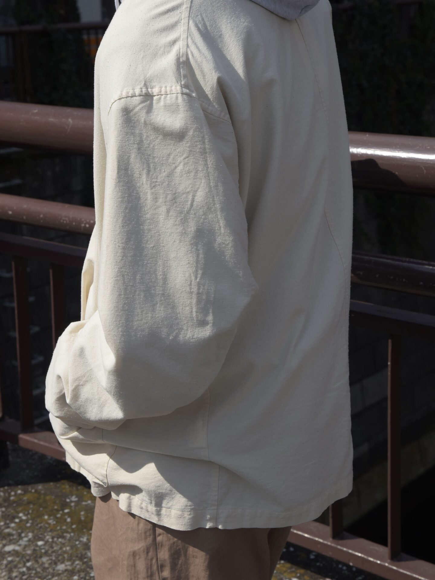 裏地も無く、アームもしっかり太め、身幅もたっぷりなので、インナーはTシャツからフーディまで様々。