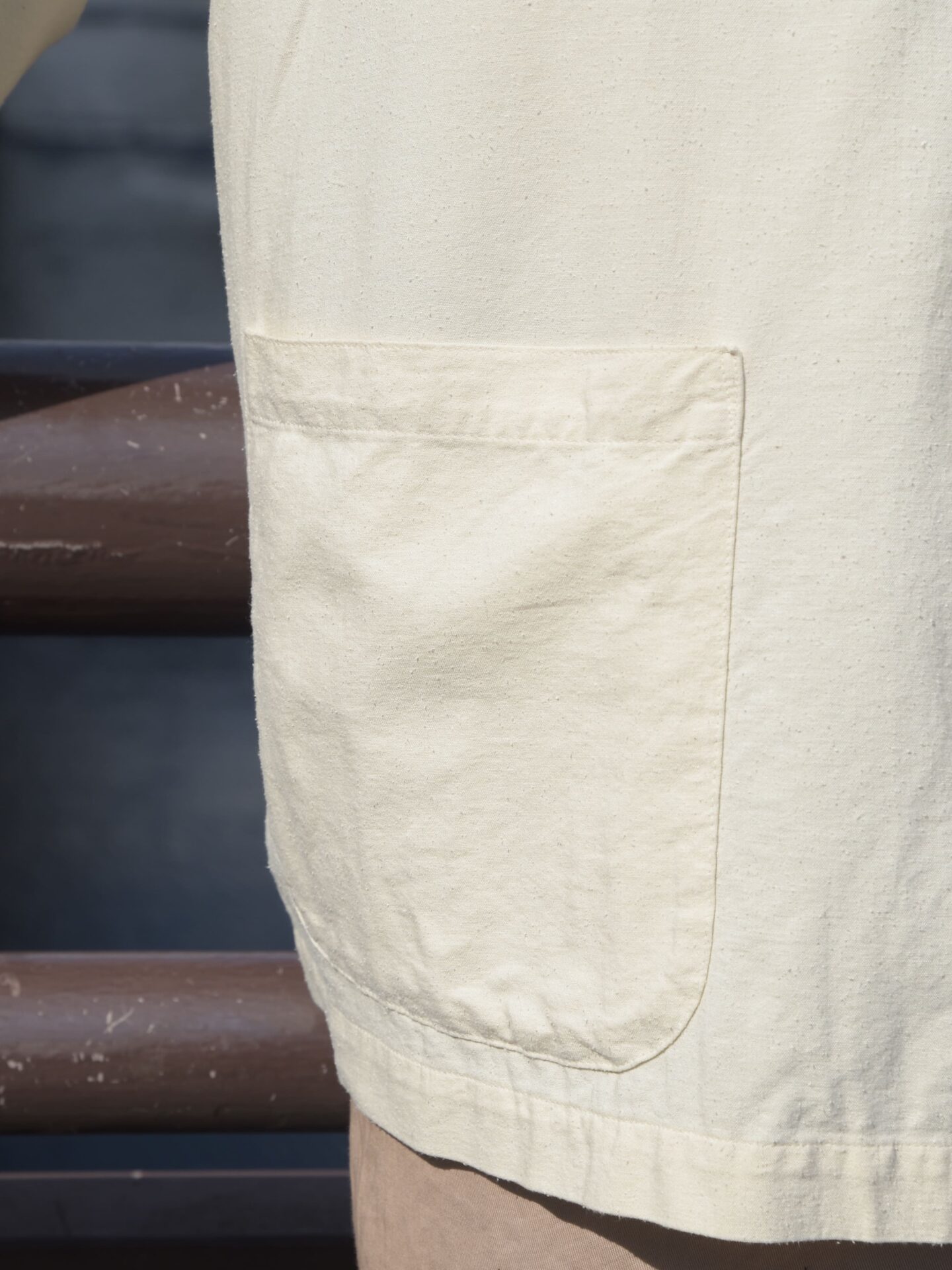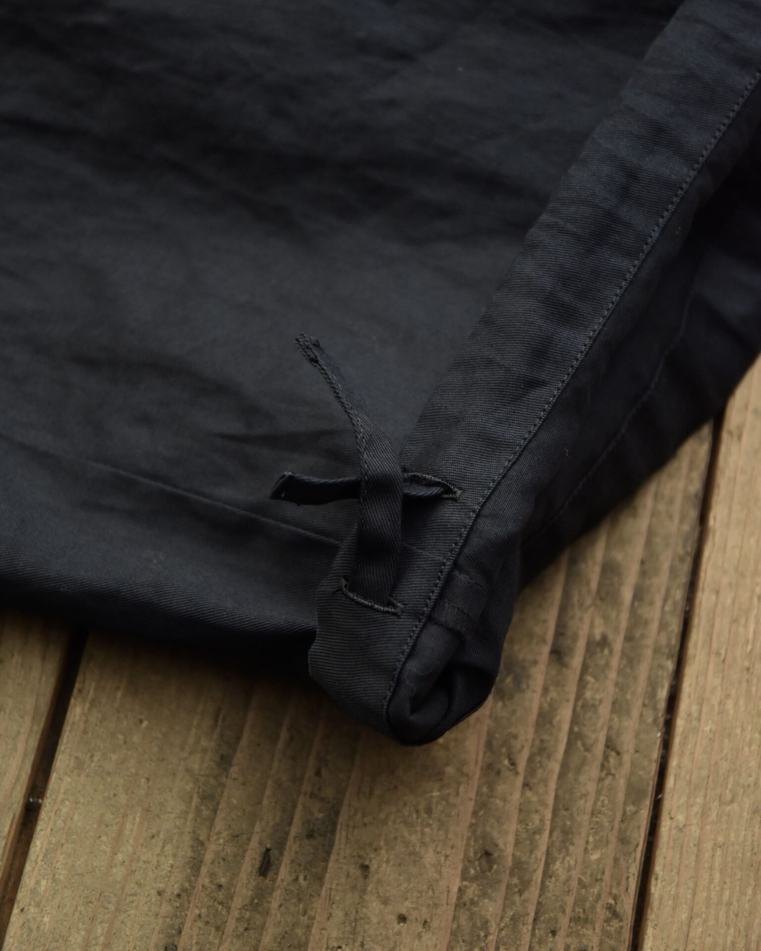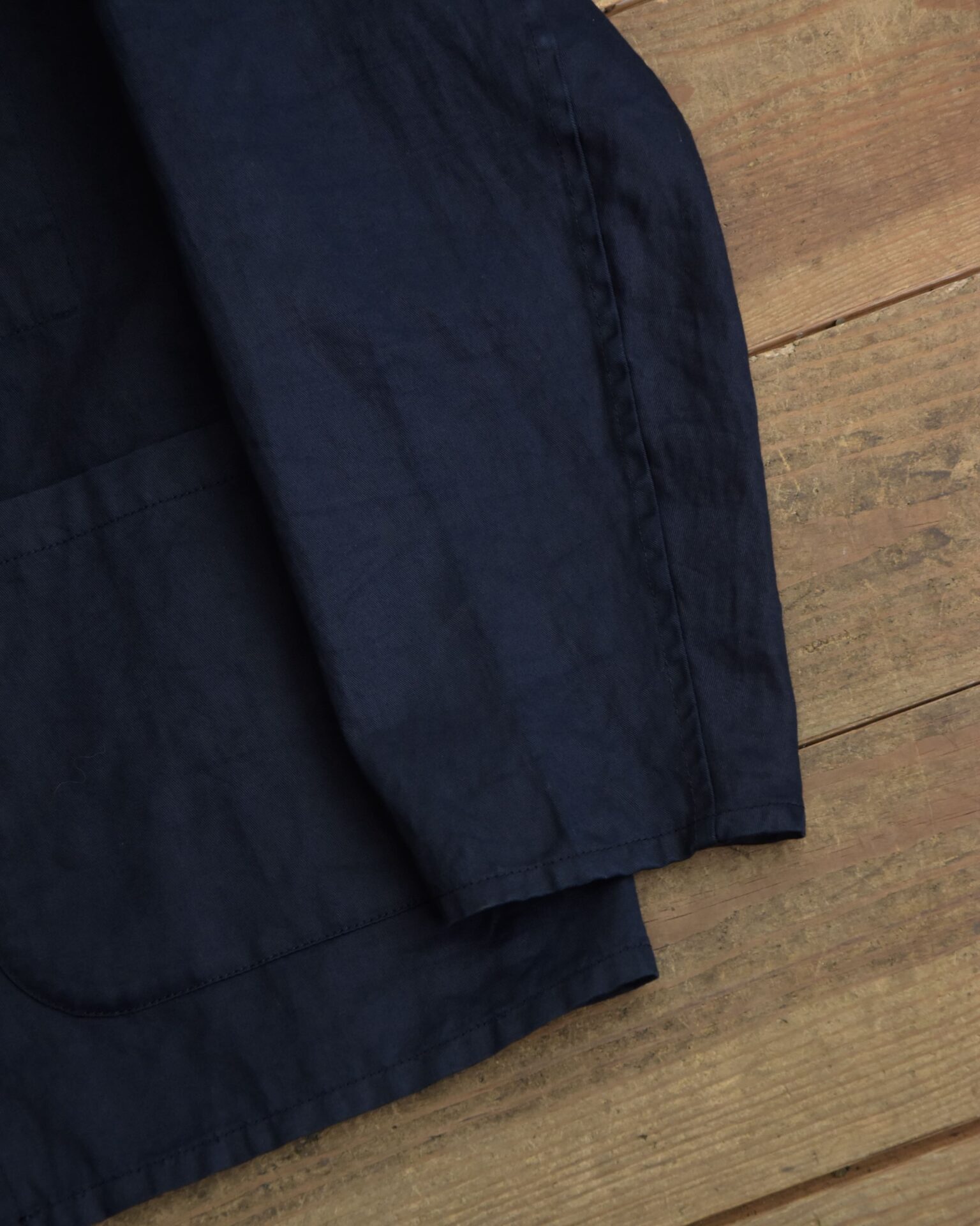 強撚の厚地のダック生地を使用しており、ダック生地と聞くとカタイイメージもあると思いますが、製品洗いにもかけているので着初めからすぐに馴染むのがポイントです。