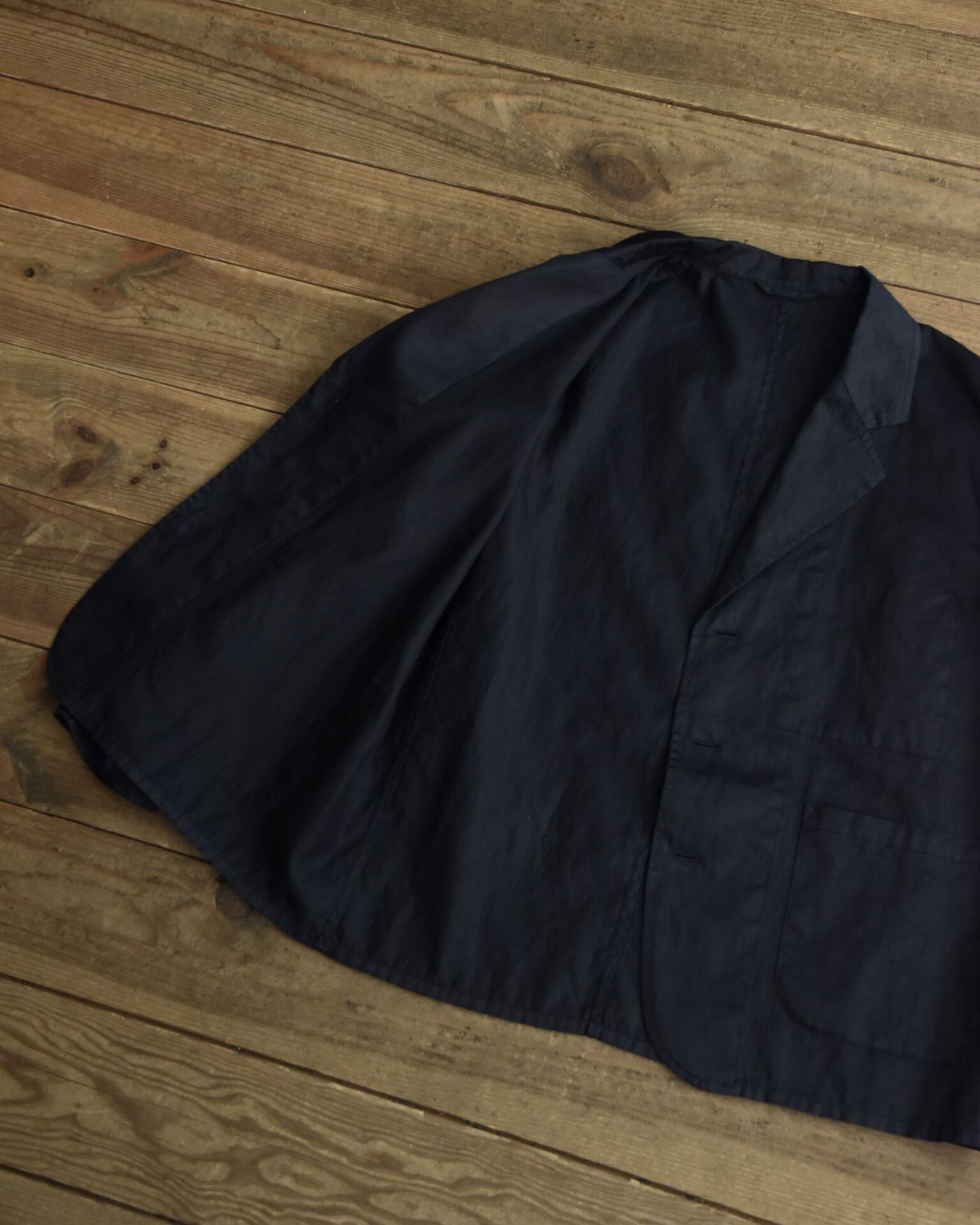 コットンツイルに特殊な加工をしてハリを出した生地を使用し、製品染で古着のような風合いに仕上がっています。