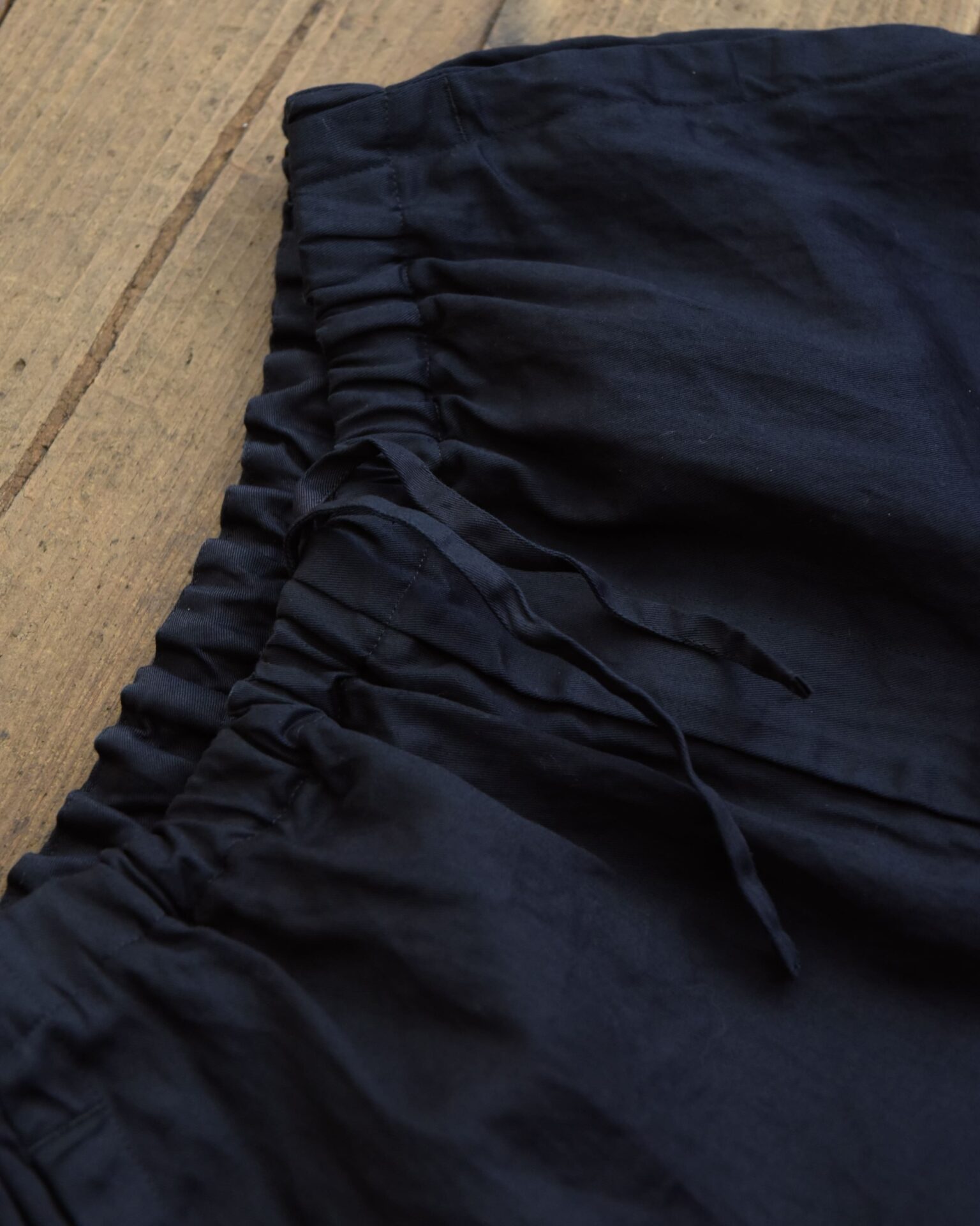 パンツはオーバーパンツをイメージした形で、こちらもコットンツイルに特殊な加工をし、製品染を。