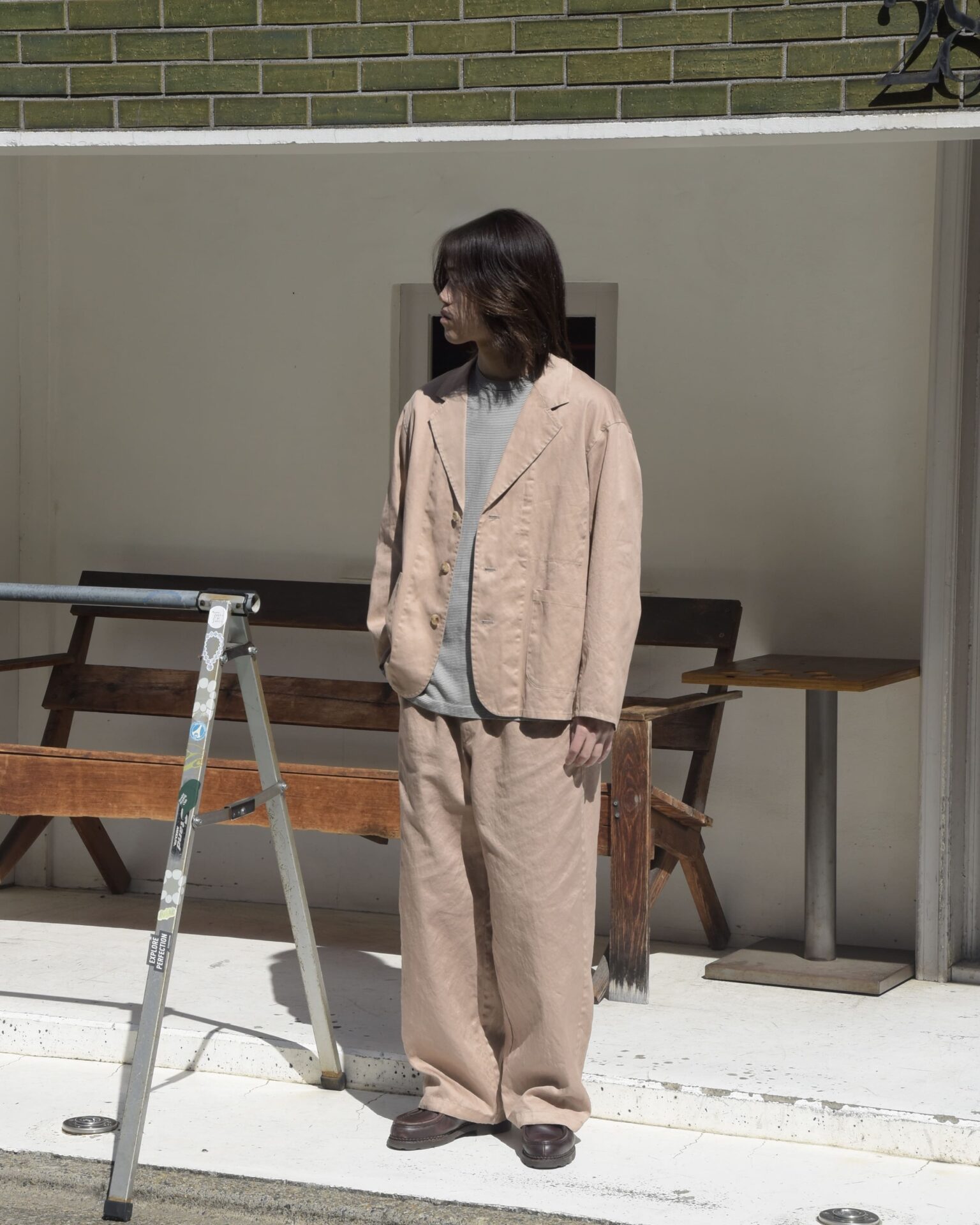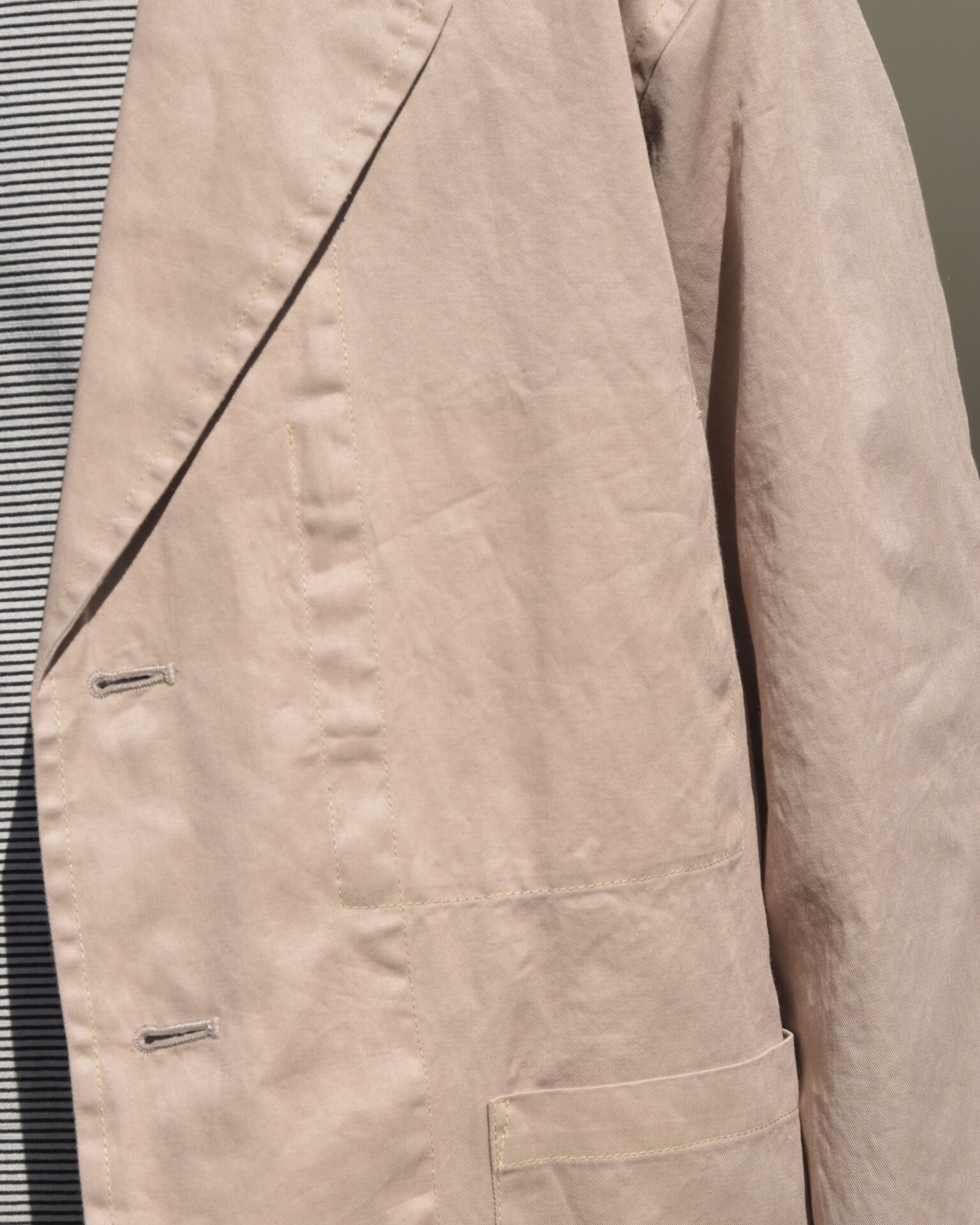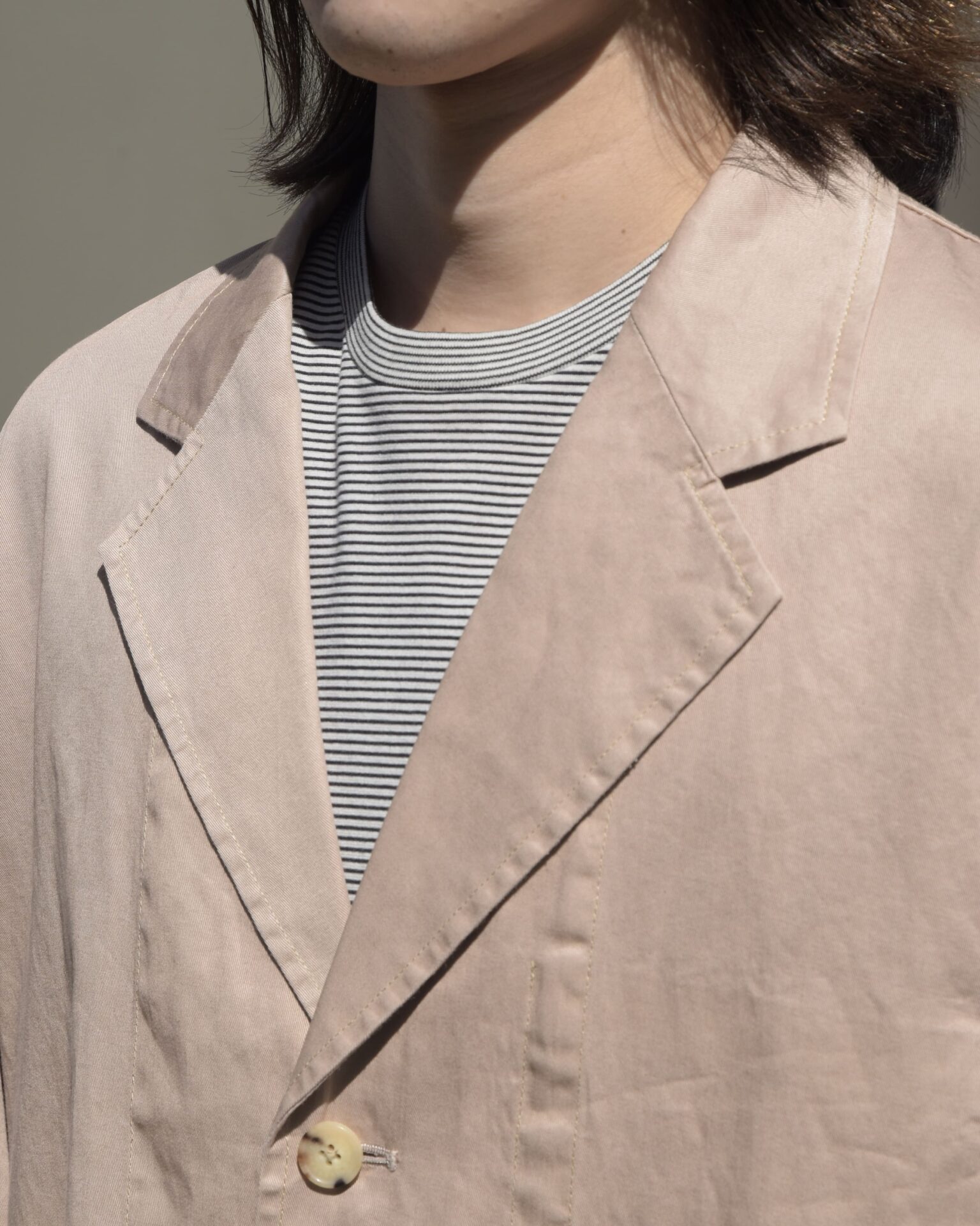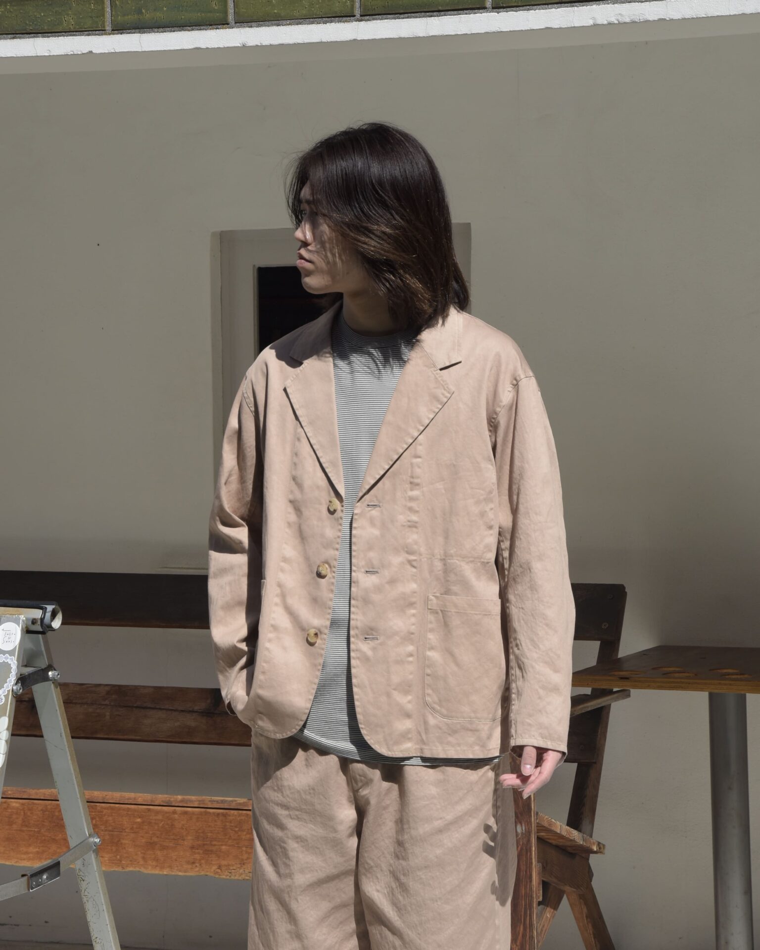 ウールとリネンのセットアップもあるなかで、このセットアップは上下どちらもコットン 100%。