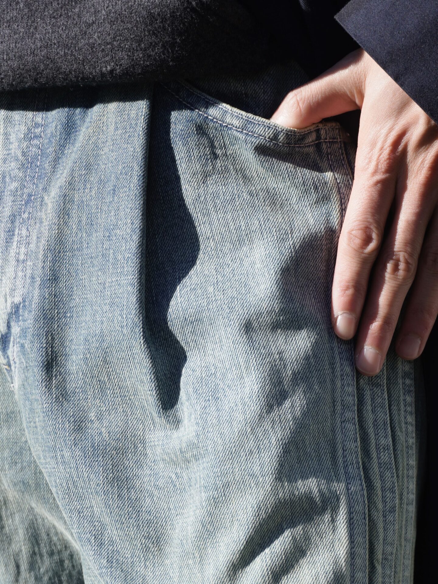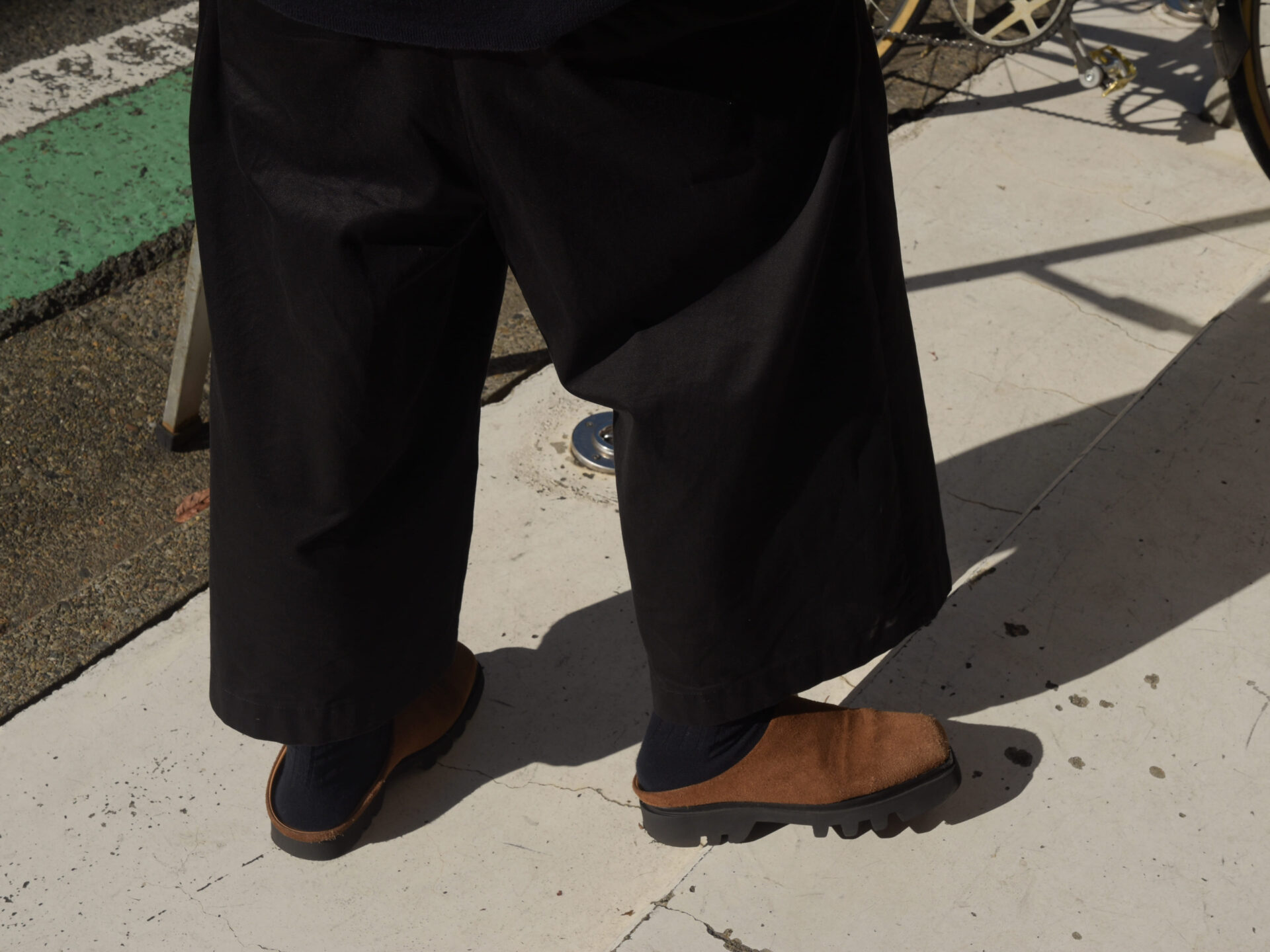 今季、UNIVERSAL PRODUCTS.から新しくリリースした”2TUCK WIDE CHINO TROUSERS”を思いっきり丈詰めした僕オリジナルのパンツ。