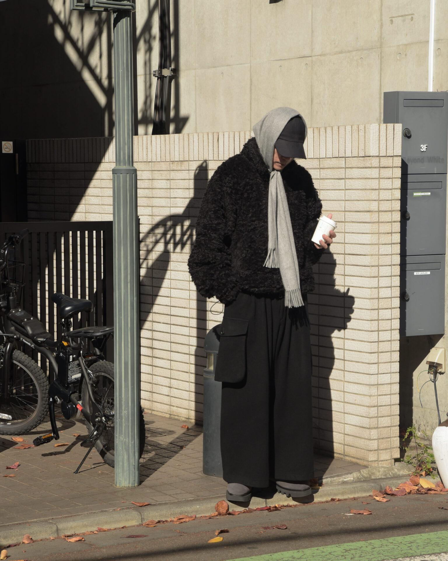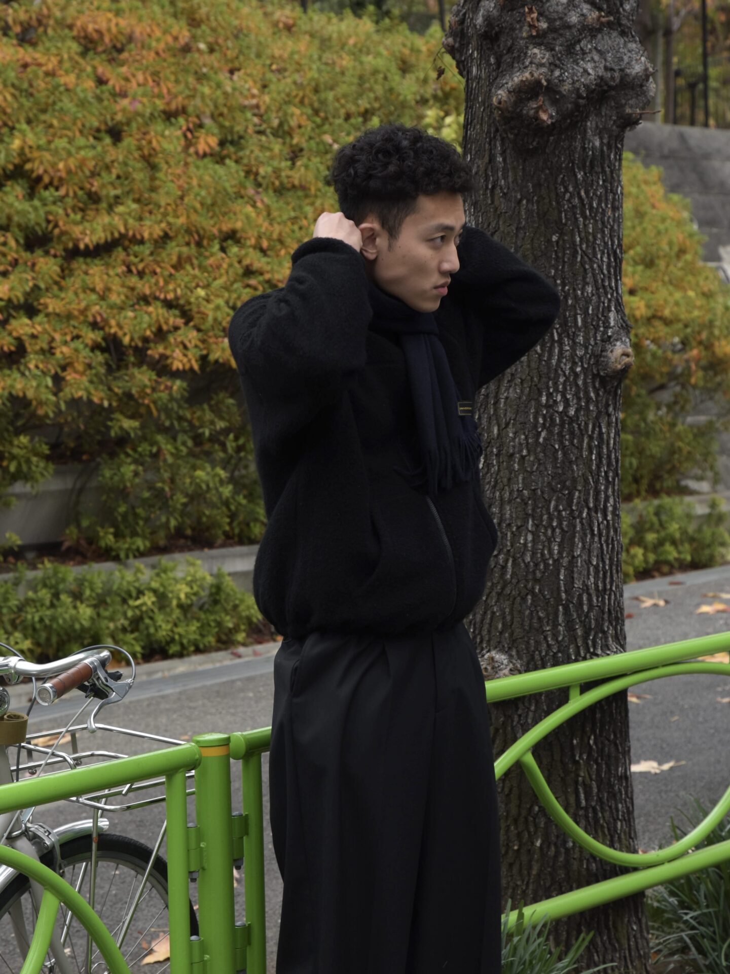 なんだか古着で見かけそうな素材感ですが、スラックスと合わせてあくまでタウンユースとして着用できるようにスタイリング。