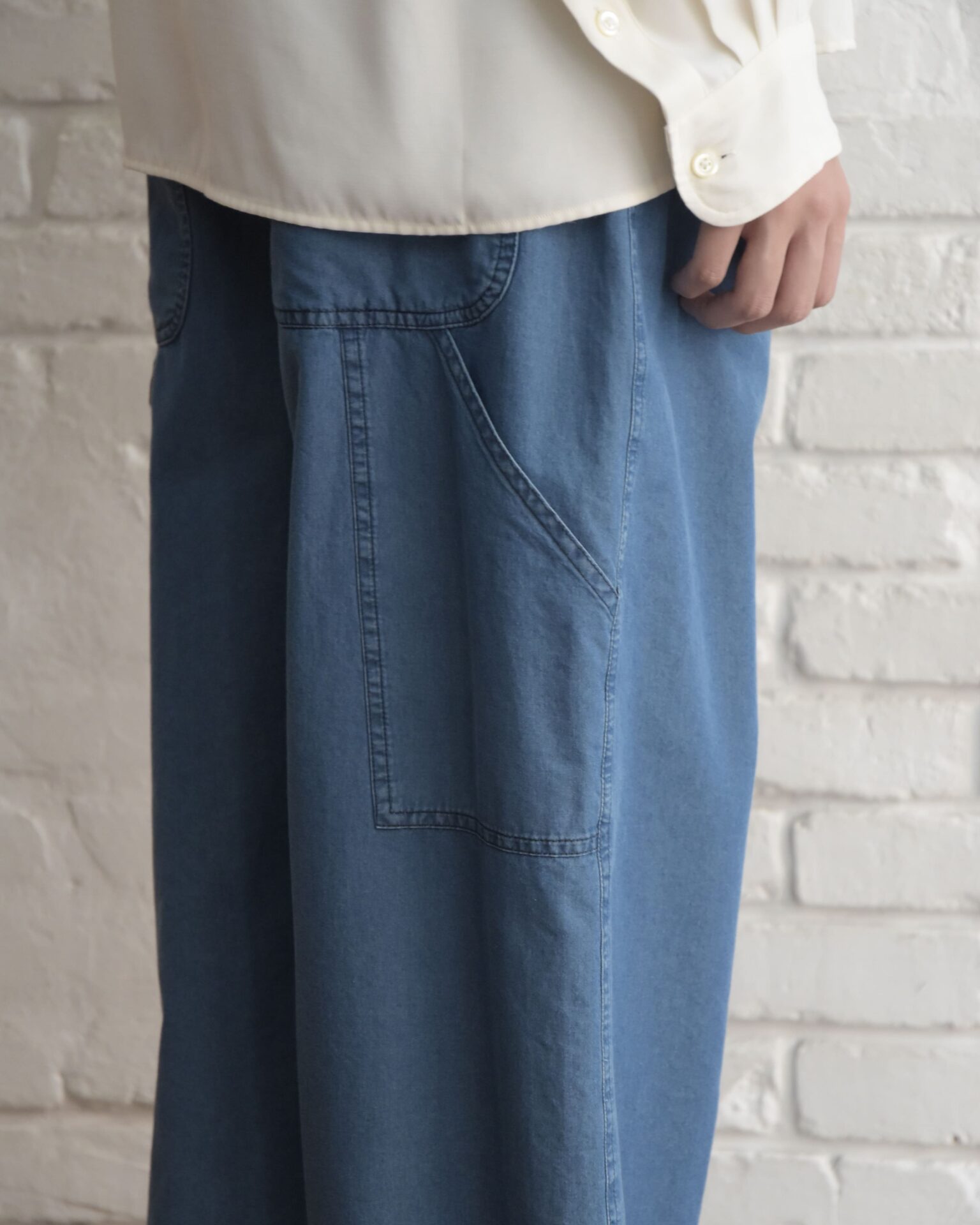 ウエストにパッチポケットを2つ、左胸にスラントポケットを1つ備え、袖口はスリット仕様です。