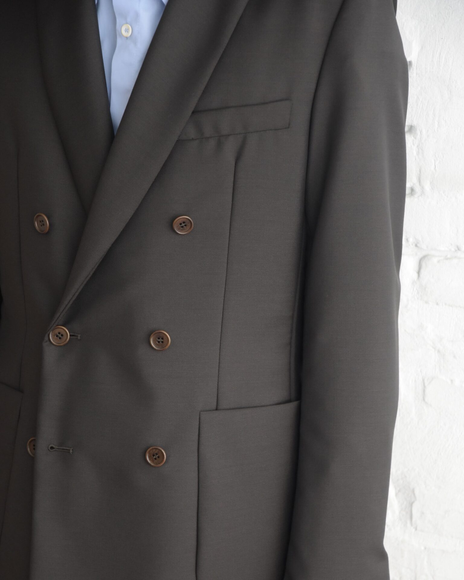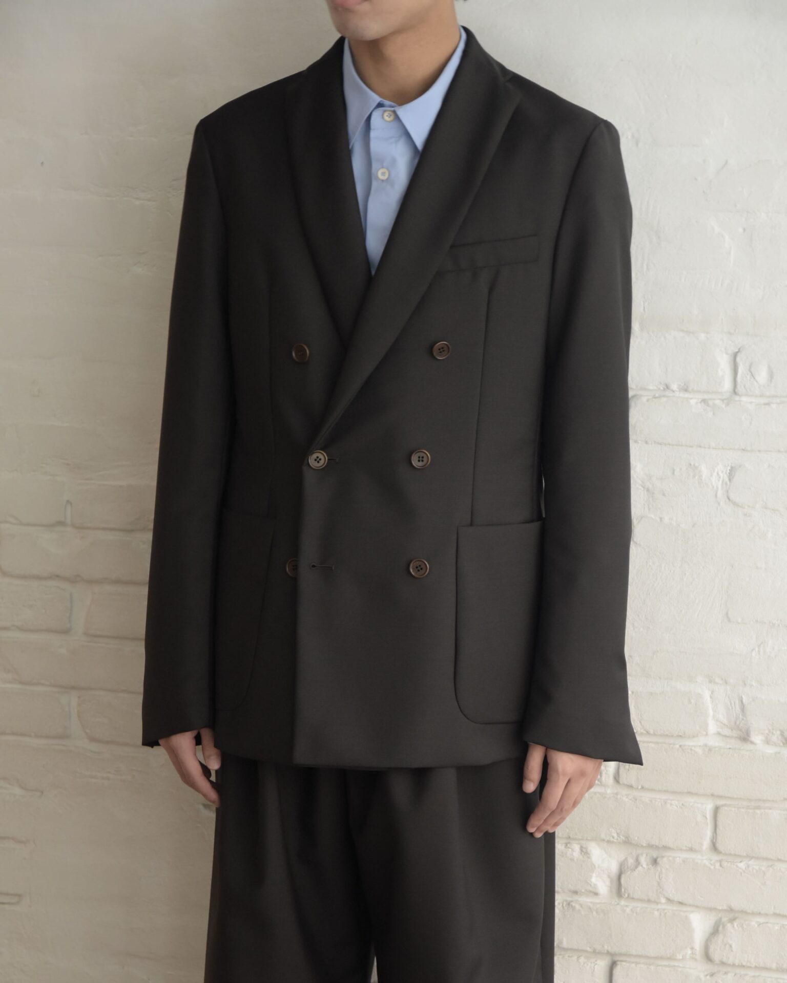 6ボタンダブルブレステッドジャケットで、春夏仕様の裏地の無い非常に軽い着心地が特徴です。