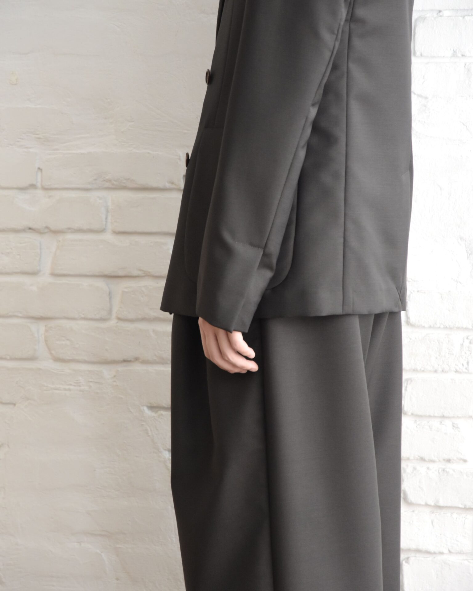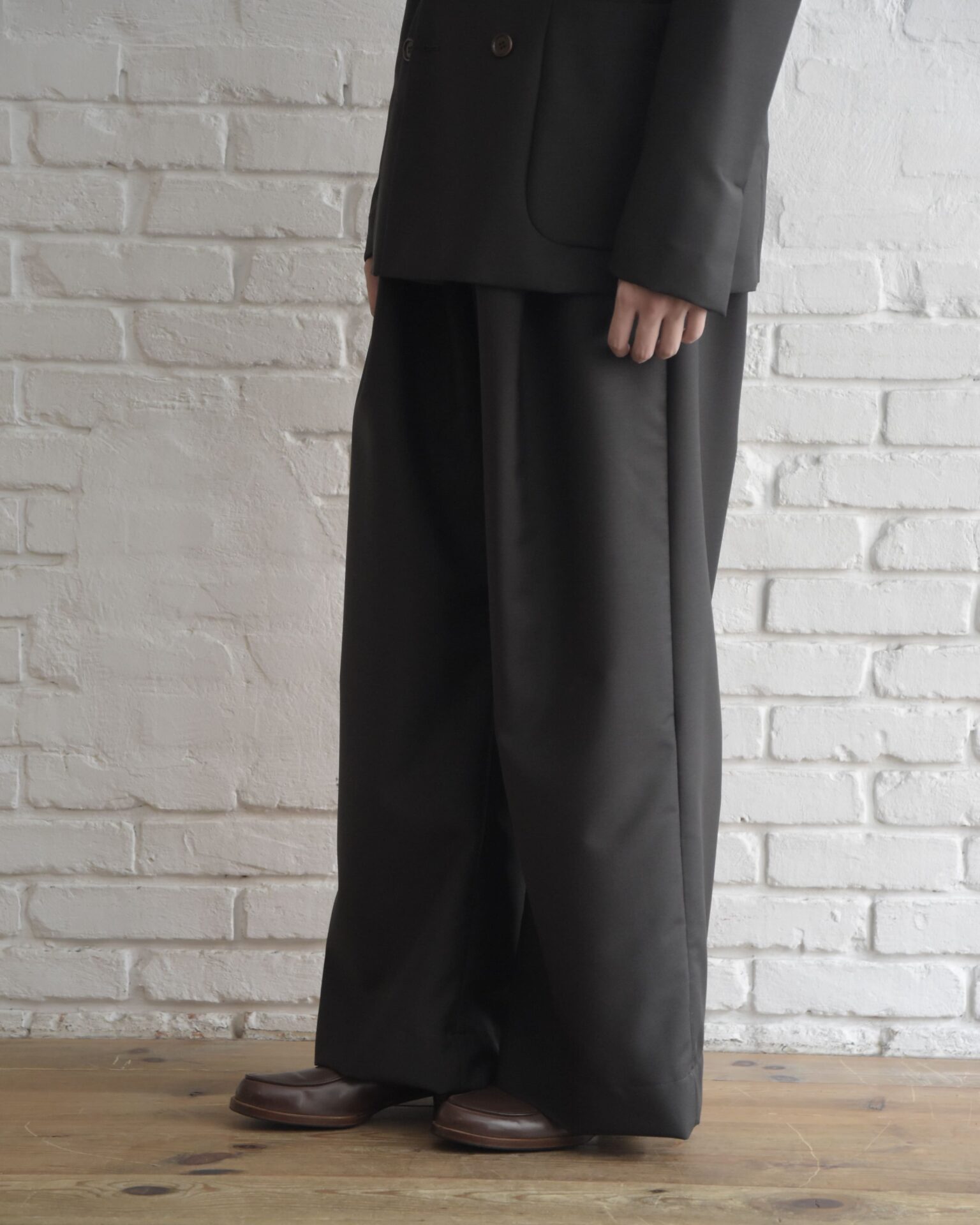 こちらも生地の軽さと上品な艶が特徴のトラウザーズ。